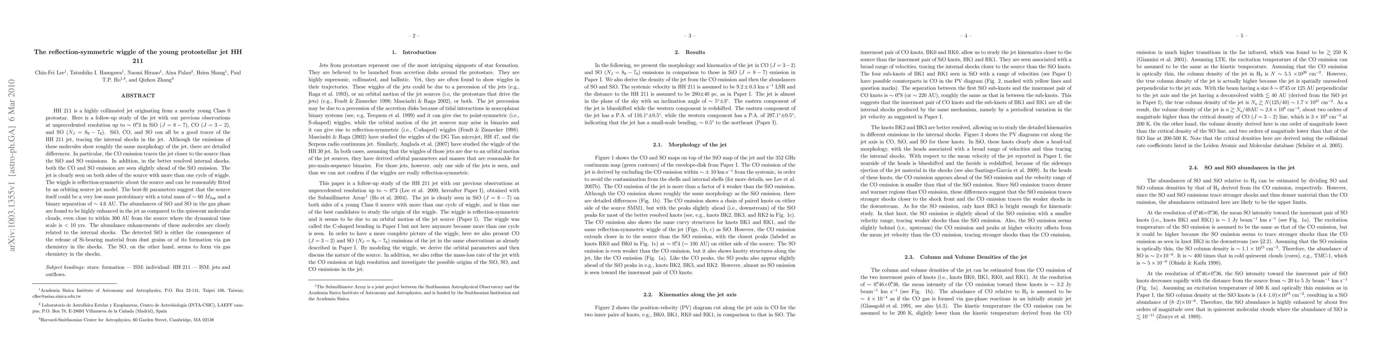 HH 211 is a highly collimated jet originating from a nearby young Class 0 protostar. Here is a follow-up study of the jet with our previous observations at unprecedented resolution up to ~ 0.3" in SiO (J=8-7), CO (J=3-2), and SO (N_J=8_9-7_8). SiO, CO, and SO can all be a good tracer of the HH 211 jet, tracing the internal shocks in the jet. Although the emissions of these molecules show roughly the same morphology of the jet, there are detailed differences. In particular, the CO emission traces the jet closer to the source than the SiO and SO emissions. In addition, in the better resolved internal shocks, both the CO and SO emission are seen slightly ahead of the SiO emission. The jet is clearly seen on both sides of the source with more than one cycle of wiggle. The wiggle is reflection-symmetric about the source and can be reasonably fitted by an orbiting source jet model. The best-fit parameters suggest that the source itself could be a very low-mass protobinary with a total mass of ~ 60 M_Jup and a binary separation of ~ 4.6 AU. The abundances of SiO and SO in the gas phase are found to be highly enhanced in the jet as compared to the quiescent molecular clouds, even close to within 300 AU from the source where the dynamical time scale is <10 yrs. The abundance enhancements of these molecules are closely related to the internal shocks. The detected SiO is either the consequence of the release of Si-bearing material from dust grains or of its formation via gas chemistry in the shocks. The SO, on the other hand, seems to form via gas chemistry in the shocks.
