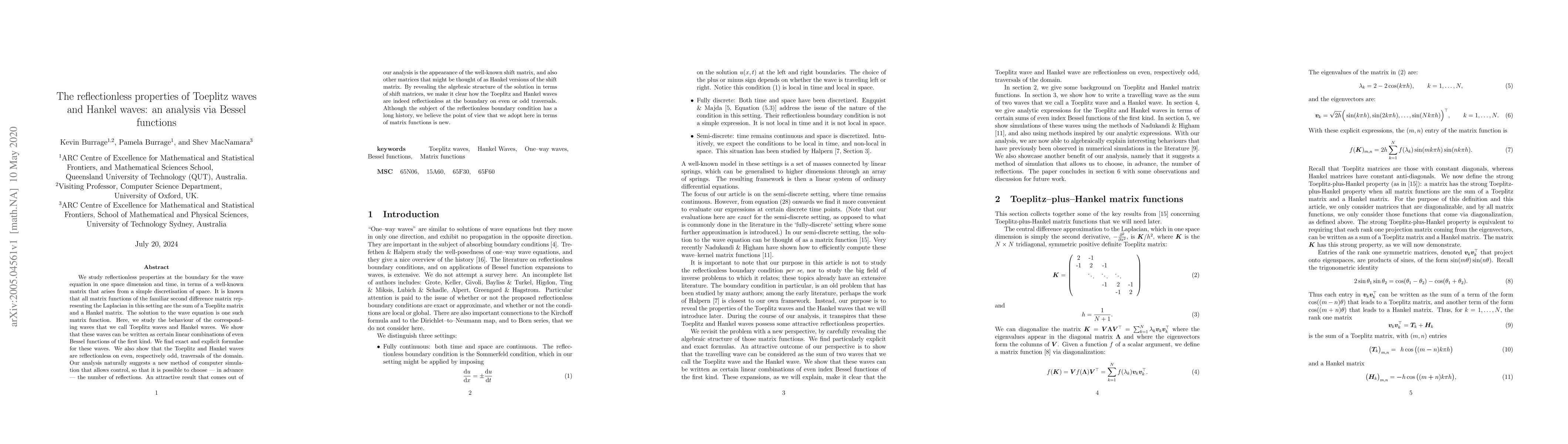 We study reflectionless properties at the boundary for the wave equation in one space dimension and time, in terms of a well-known matrix that arises from a simple discretisation of space. It is known that all matrix functions of the familiar second difference matrix representing the Laplacian in this setting are the sum of a Toeplitz matrix and a Hankel matrix. The solution to the wave equation is one such matrix function. Here, we study the behaviour of the corresponding waves that we call Toeplitz waves and Hankel waves. We show that these waves can be written as certain linear combinations of even Bessel functions of the first kind. We find exact and explicit formulae for these waves. We also show that the Toeplitz and Hankel waves are reflectionless on even, respectively odd, traversals of the domain. Our analysis naturally suggests a new method of computer simulation that allows control, so that it is possible to choose -- in advance -- the number of reflections. An attractive result that comes out of our analysis is the appearance of the well-known shift matrix, and also other matrices that might be thought of as Hankel versions of the shift matrix. By revealing the algebraic structure of the solution in terms of shift matrices, we make it clear how the Toeplitz and Hankel waves are indeed reflectionless at the boundary on even or odd traversals. Although the subject of the reflectionless boundary condition has a long history, we believe the point of view that we adopt here in terms of matrix functions is new.