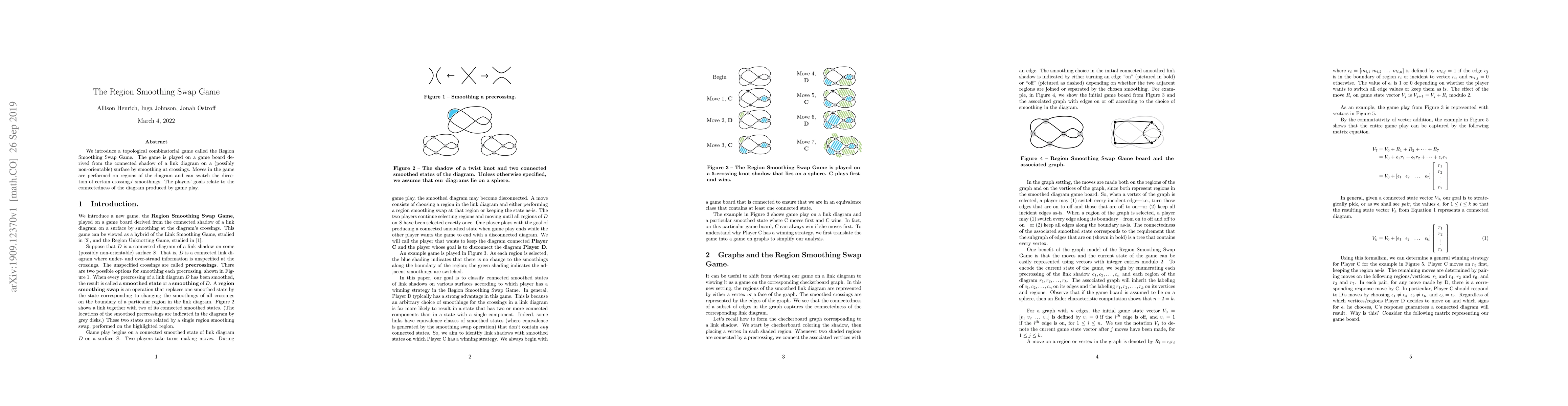 The Region Smoothing Swap Game is a topological combinatorial game played on a board derived from link diagrams, where players manipulate regions to switch crossing smoothing directions, aiming to achieve specific diagram connectedness outcomes. The game's rules and objectives are based on the topological properties of the resulting diagram.