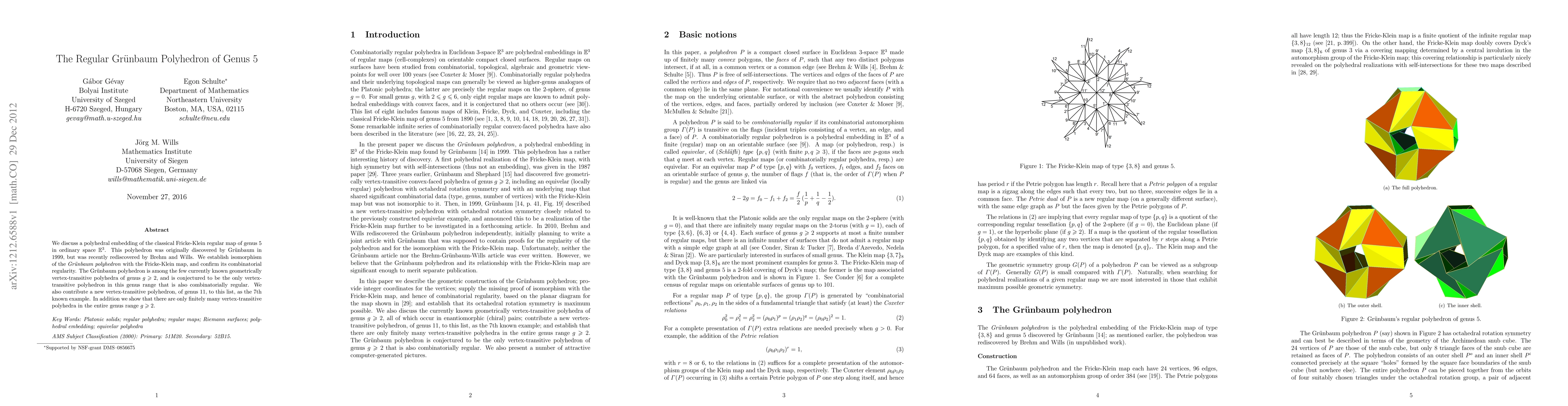 We discuss a polyhedral embedding of the classical Fricke-Klein regular map of genus 5 in ordinary 3-space. This polyhedron was originally discovered by Grunbaum in 1999, but was recently rediscovered by Brehm and Wills. We establish isomorphism of the Grunbaum polyhedron with the Fricke-Klein map, and confirm its combinatorial regularity. The Grunbaum polyhedron is among the few currently known geometrically vertex-transitive polyhedra of genus g > 2, and is conjectured to be the only vertex-transitive polyhedron in this genus range that is also combinatorially regular. We also contribute a new vertex-transitive polyhedron, of genus 11, to this list, as the 7th known example. In addition we show that there are only finitely many vertex-transitive polyhedra in the entire genus range g > 2.