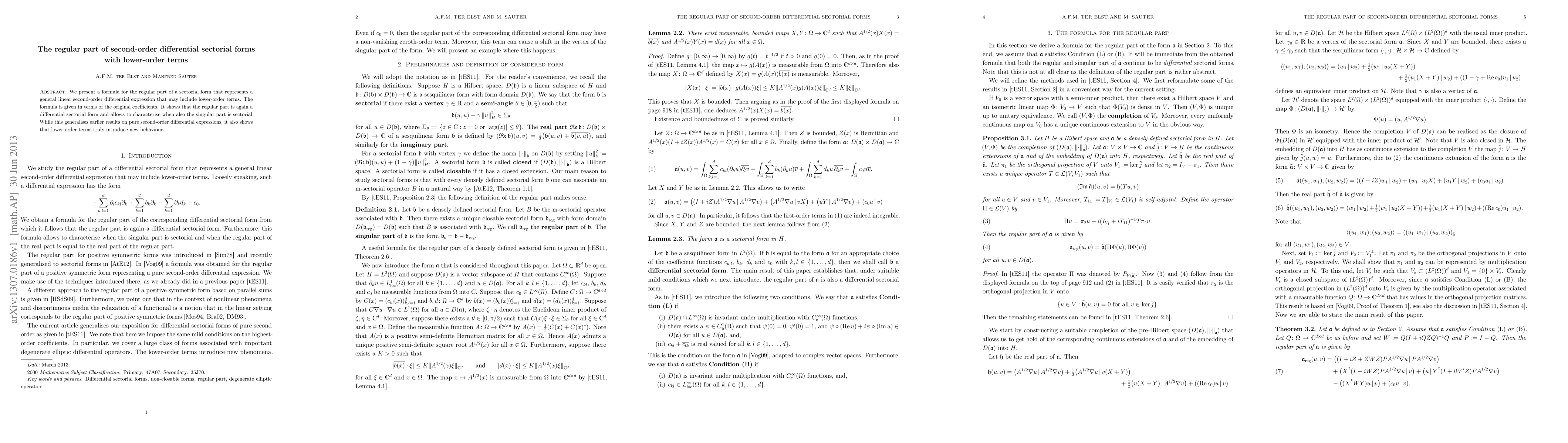 We present a formula for the regular part of a sectorial form that represents a general linear second-order differential expression that may include lower-order terms. The formula is given in terms of the original coefficients. It shows that the regular part is again a differential sectorial form and allows to characterise when also the singular part is sectorial. While this generalises earlier results on pure second-order differential expressions, it also shows that lower-order terms truly introduce new behaviour.