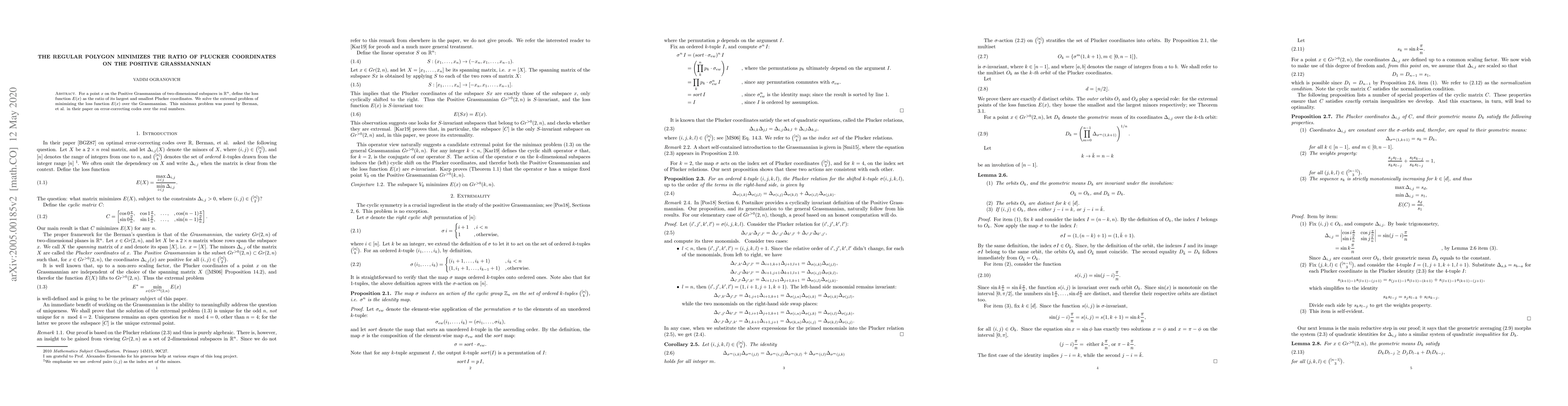 The paper investigates the minimization of the loss function $E(x)$ on the Positive Grassmannian, defined as the ratio of the largest and smallest Plücker coordinates. The study concludes that regular polygons exhibit the minimum value for this ratio.