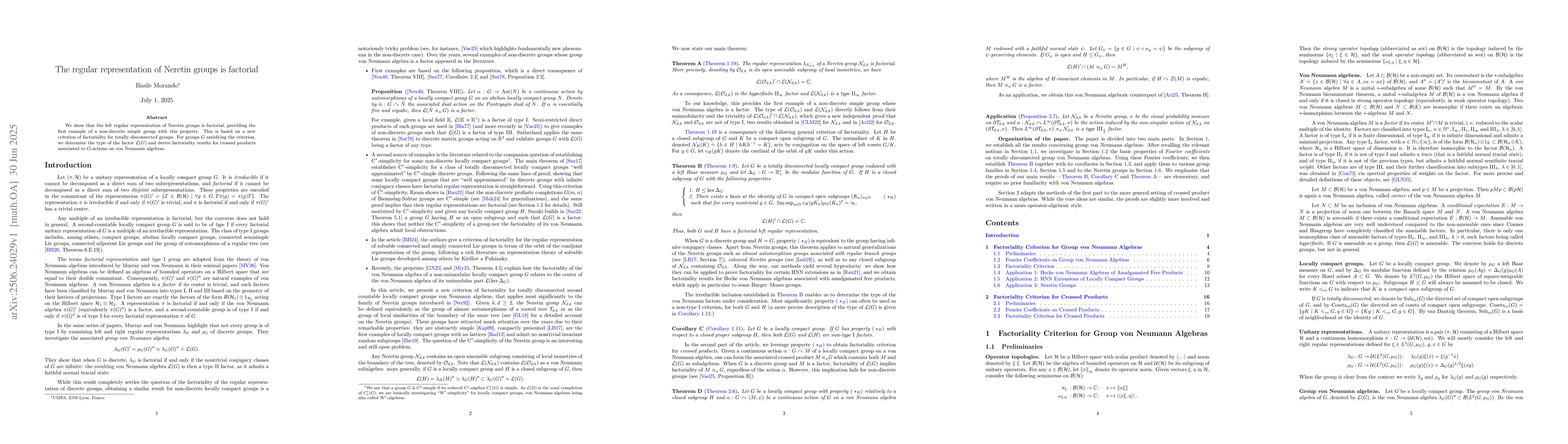 We show that the left regular representation of Neretin groups is factorial, providing the first example of a non-discrete simple group with this property. This is based on a new criterion of factoriality for totally disconnected groups. For groups G satisfying the criterion, we determine the type of the factor L(G) and derive factoriality results for crossed products associated to G-actions on von Neumann algebras.