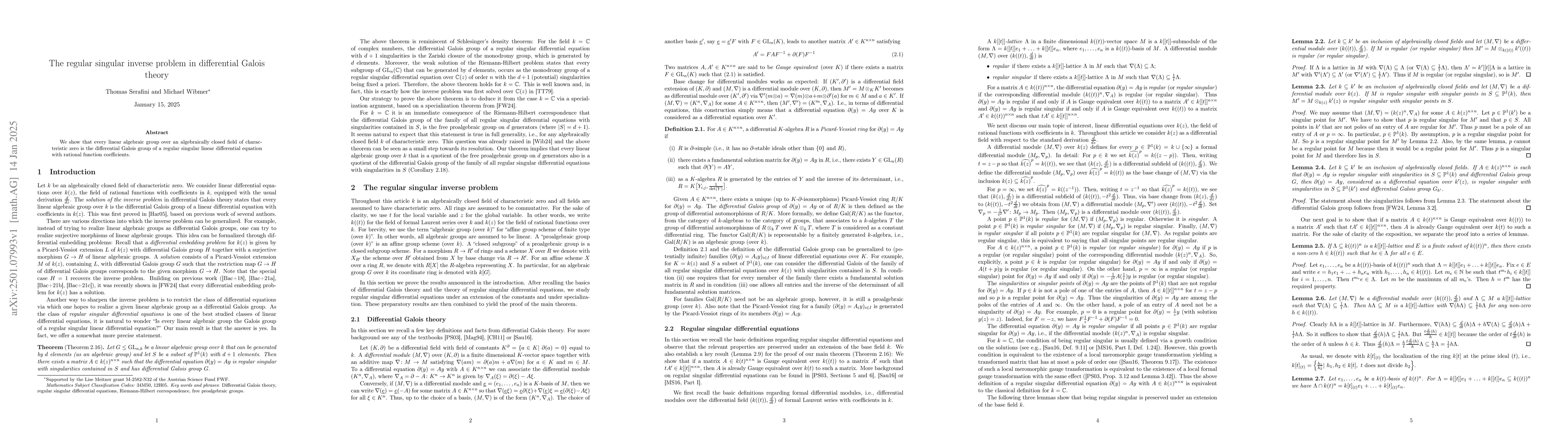 Summary: This paper demonstrates that any linear algebraic group over a characteristic zero field can be represented as the differential Galois group for a regular singular linear differential equation with rational function coefficients. This establishes a connection between algebraic groups and differential equations.