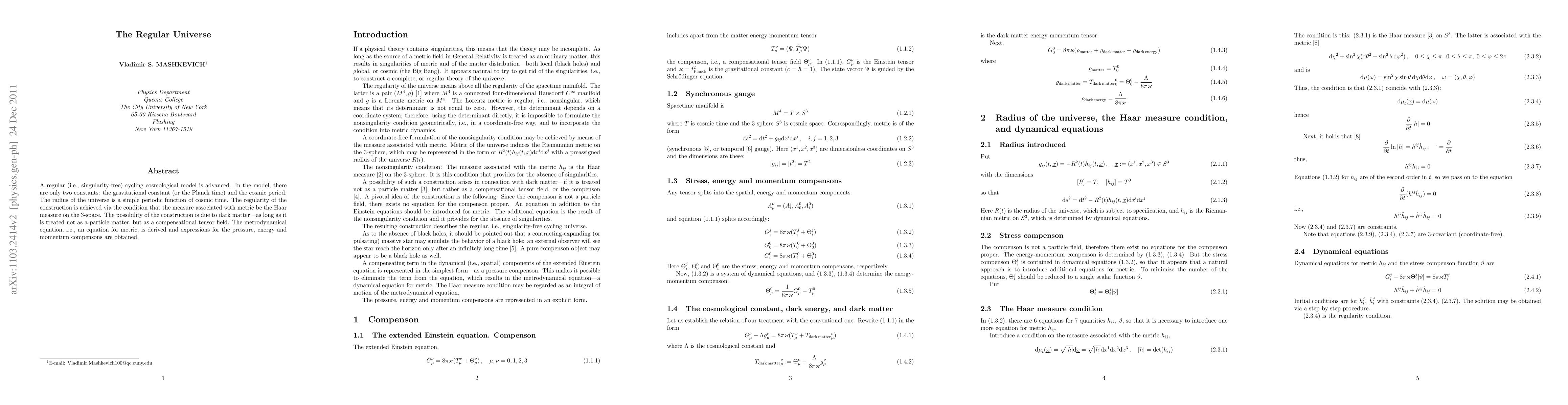 A regular (i.e., singularity-free) cycling cosmological model is advanced. In the model, there are only two constants: the gravitational constant (or the Planck time) and the cosmic period. The radius of the universe is a simple periodic function of cosmic time. The regularity of the construction is achieved via the condition that the measure associated with metric be the Haar measure on the 3-space. The possibility of the construction is due to dark matter---as long as it is treated not as a particle matter, but as a compensational tensor field. The metrodynamical equation, i.e., an equation for metric, is derived and expressions for the pressure, energy and momentum compensons are obtained.