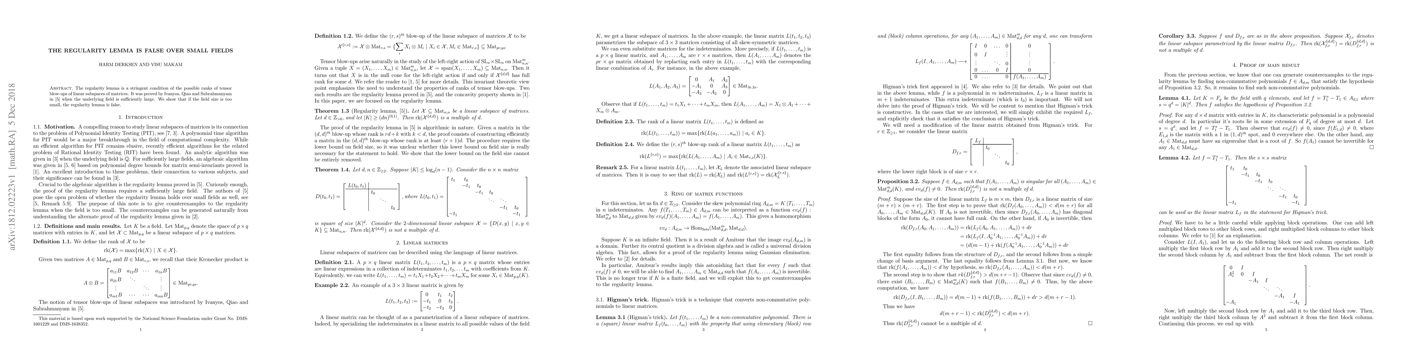 The regularity lemma is a stringent condition of the possible ranks of tensor blow-ups of linear subspaces of matrices. It was proved by Ivanyos, Qiao and Subrahmanyam when the underlying field is sufficiently large. We show that if the field size is too small, the regularity lemma is false.