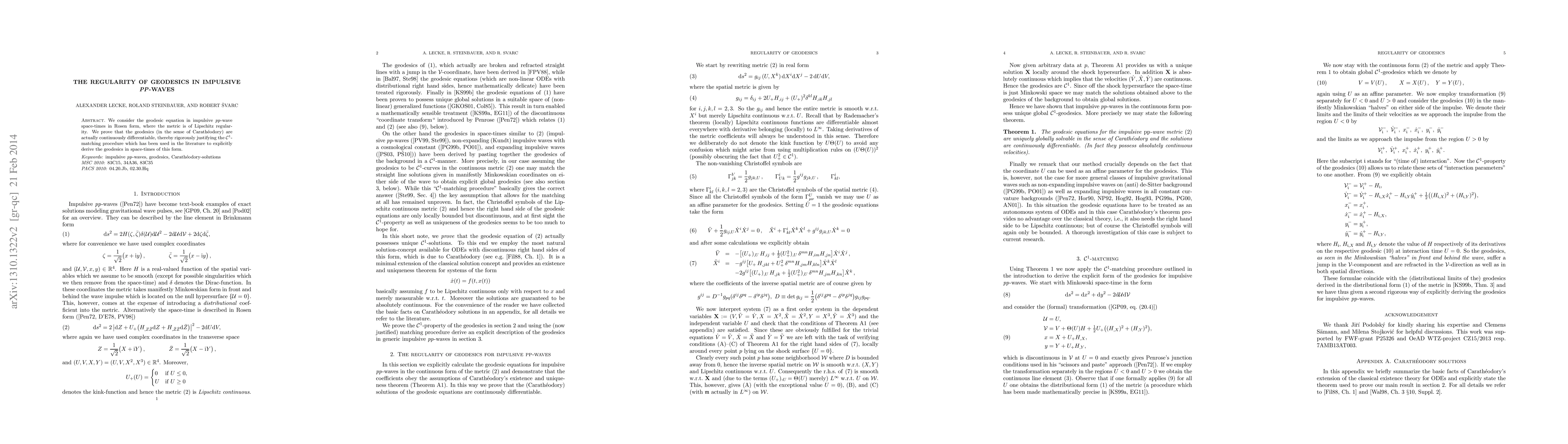 This paper explores geodesics in impulsive pp-wave space-times with Lipschitz regularity, proving that they are continuously differentiable. This result supports the $C^1$-matching procedure used to derive geodesics in such space-times.