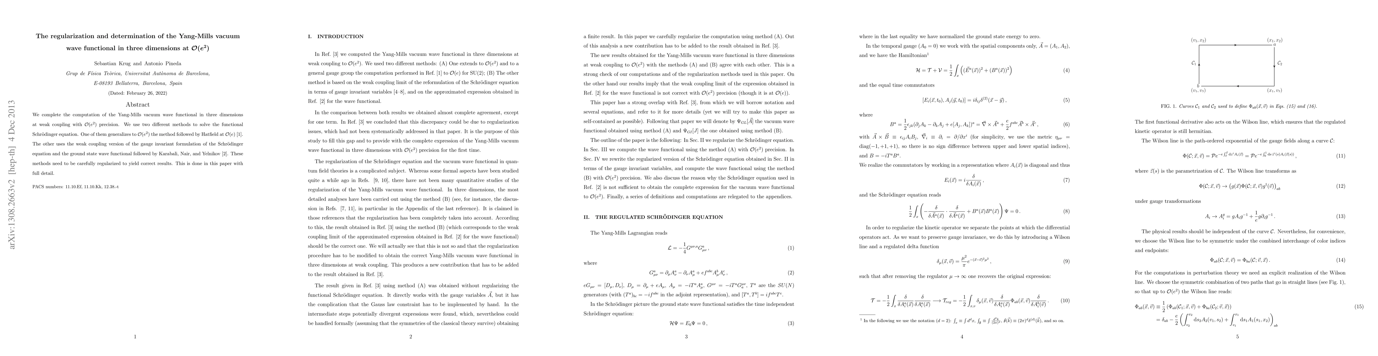 This paper computes the Yang-Mills vacuum wave functional in three dimensions at O(e^2) precision using two distinct regularization methods. It details the regularization process necessary to achieve accurate results, generalizing previous methods to higher order.