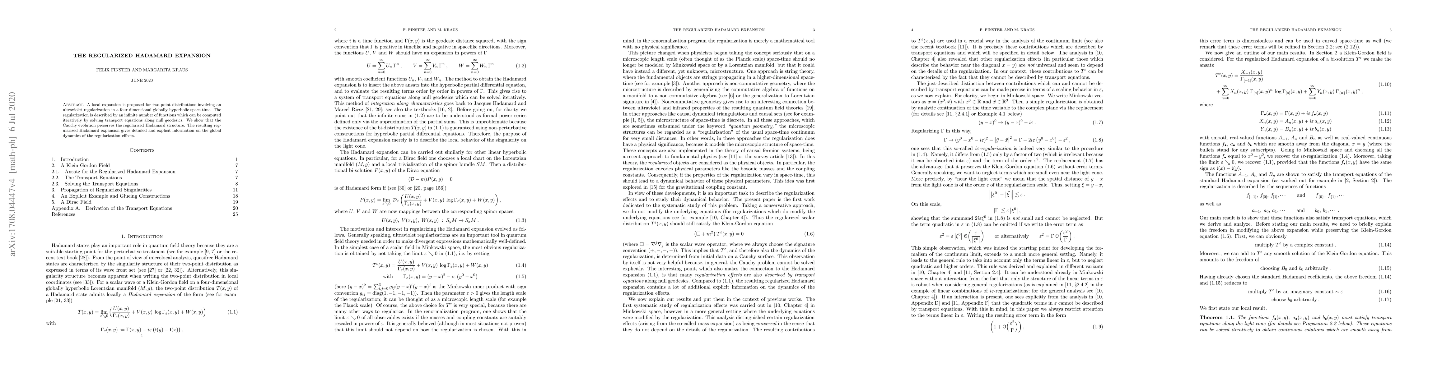 A local expansion is proposed for two-point distributions involving an ultraviolet regularization in a four-dimensional globally hyperbolic space-time. The regularization is described by an infinite number of functions which can be computed iteratively by solving transport equations along null geodesics. We show that the Cauchy evolution preserves the regularized Hadamard structure. The resulting regularized Hadamard expansion gives detailed and explicit information on the global dynamics of the regularization effects.