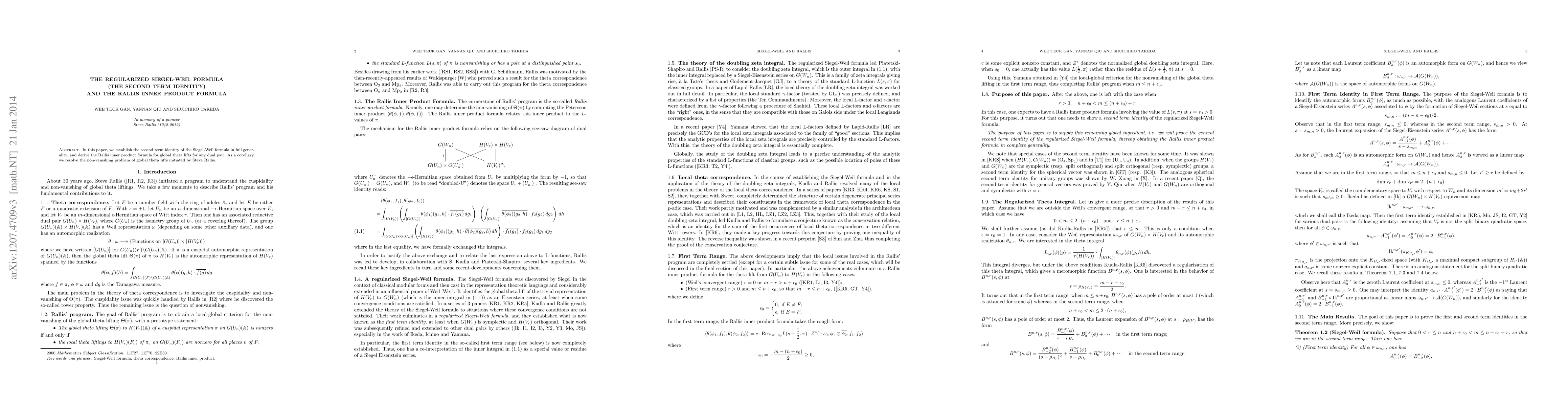 This paper establishes the second term identity of the Siegel-Weil formula and derives the Rallis inner product formula for global theta lifts, resolving a long-standing problem in the field of representation theory.