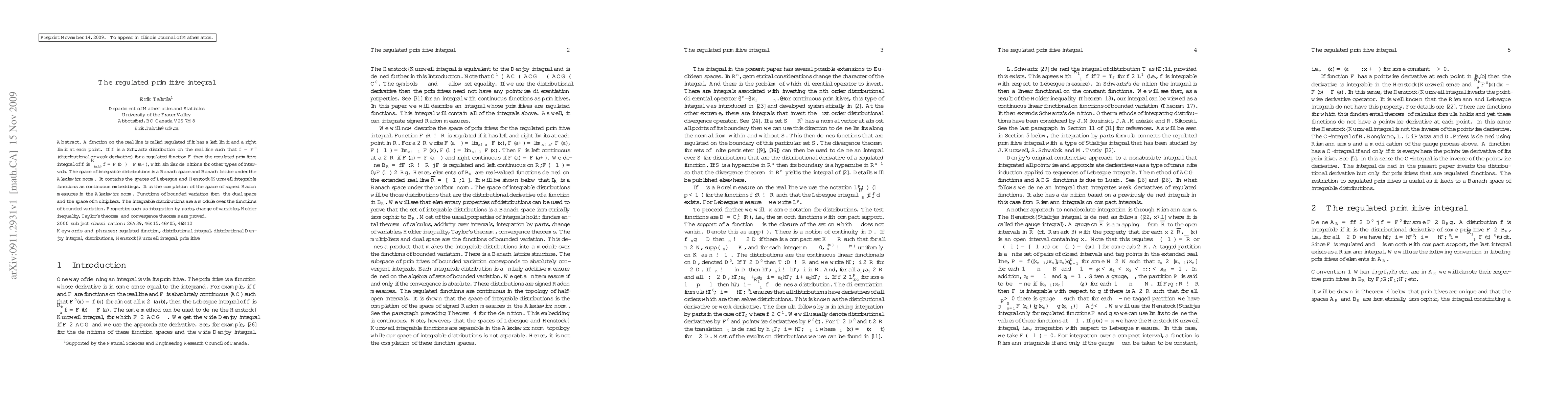 This paper defines the regulated primitive integral for distributions on the real line, showing it aligns with the distributional derivative of regulated functions. It establishes the space of integrable distributions as a Banach space and Banach lattice, embedding Lebesgue and Henstock-Kurzweil integrable functions, and proving properties like integration by parts and convergence theorems.