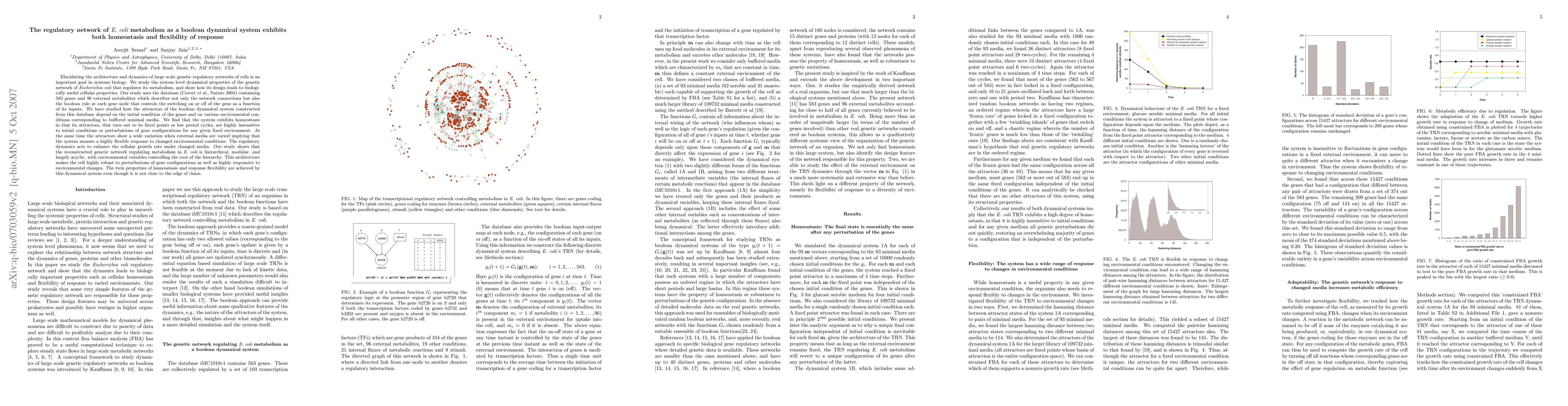 The E. coli metabolism network exhibits both homeostasis and flexibility in response to environmental changes, with a hierarchical and modular architecture that enhances cellular growth rate.