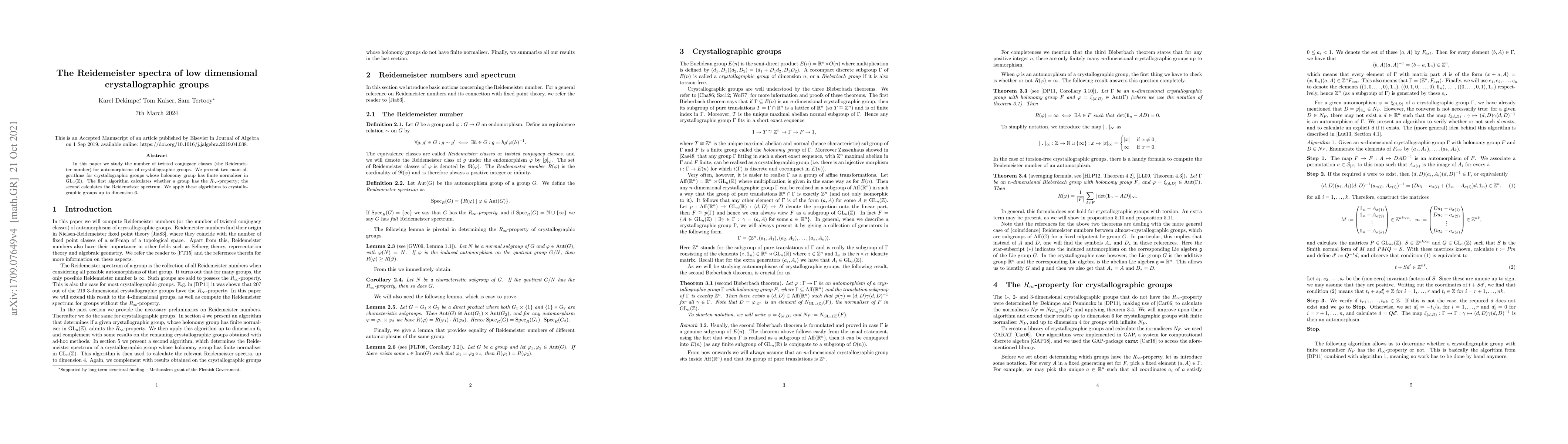 This paper develops algorithms to determine the Reidemeister spectra of low-dimensional crystallographic groups, focusing on their twisted conjugacy classes, and applies these methods to groups in dimensions up to 6. The study identifies groups with the $R_\infty$-property and computes their Reidemeister spectra.