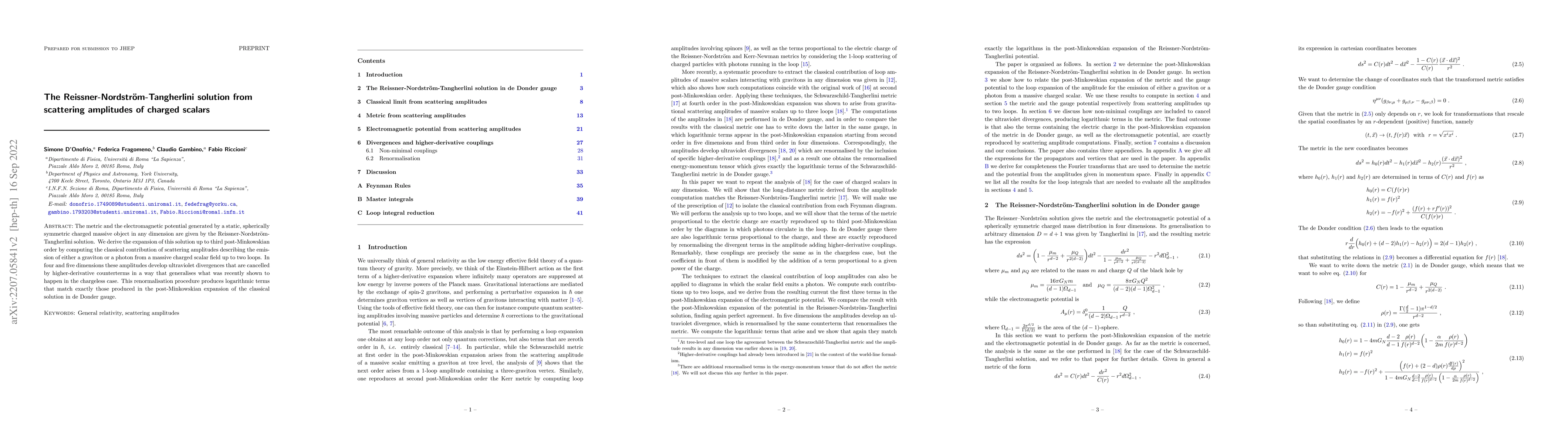 This paper derives the Reissner-Nordström-Tangherlini solution through the expansion of scattering amplitudes for charged scalars, showing that ultraviolet divergences in four and five dimensions are cancelled by higher-derivative counterterms. The renormalisation procedure matches logarithmic terms from the post-Minkowskian expansion.