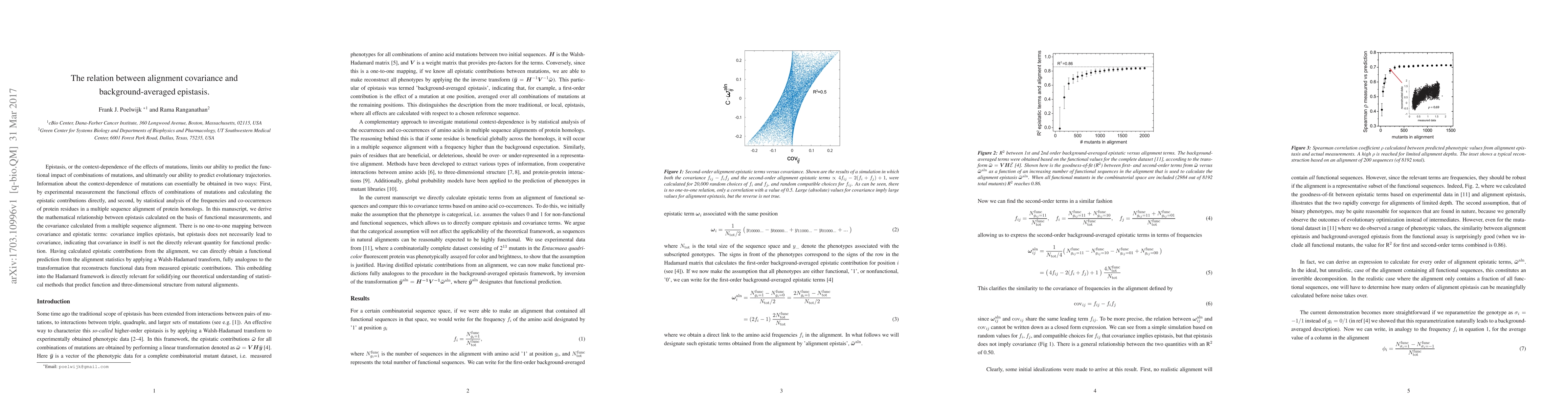 This paper establishes a mathematical relationship between epistasis derived from functional measurements and covariance from protein sequence alignments, showing that while covariance implies epistasis, the reverse is not necessarily true. It also demonstrates a method to predict function using alignment statistics via a Walsh-Hadamard transform.