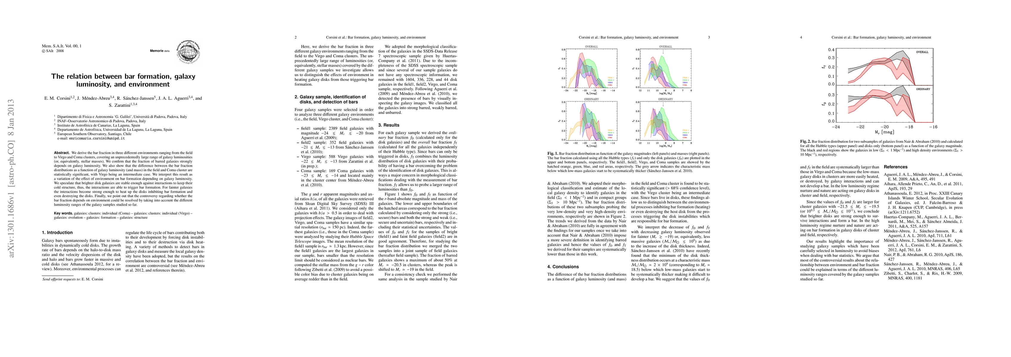 The study analyzed bar fractions in three environments: field, Virgo cluster, and Coma cluster, using samples of galaxies spanning a wide range of luminosities (or stellar masses). Galaxies were identified and classified based on their axial ratios and morphological types from the Sloan Digital Sky Survey (SDSS). Bar presence was determined through visual inspection of galaxy images.