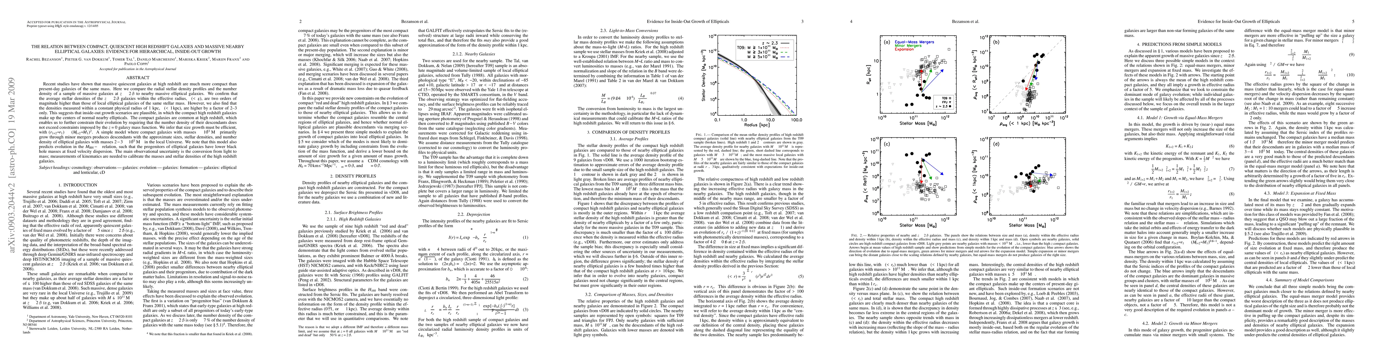 This study finds that massive, quiescent galaxies at high redshift are significantly more compact than their present-day counterparts, supporting an inside-out growth model where these compact galaxies evolve into the central regions of nearby elliptical galaxies. The model suggests that size growth is efficient and driven by minor mergers, leading to the observed stellar densities and number densities in local elliptical galaxies.