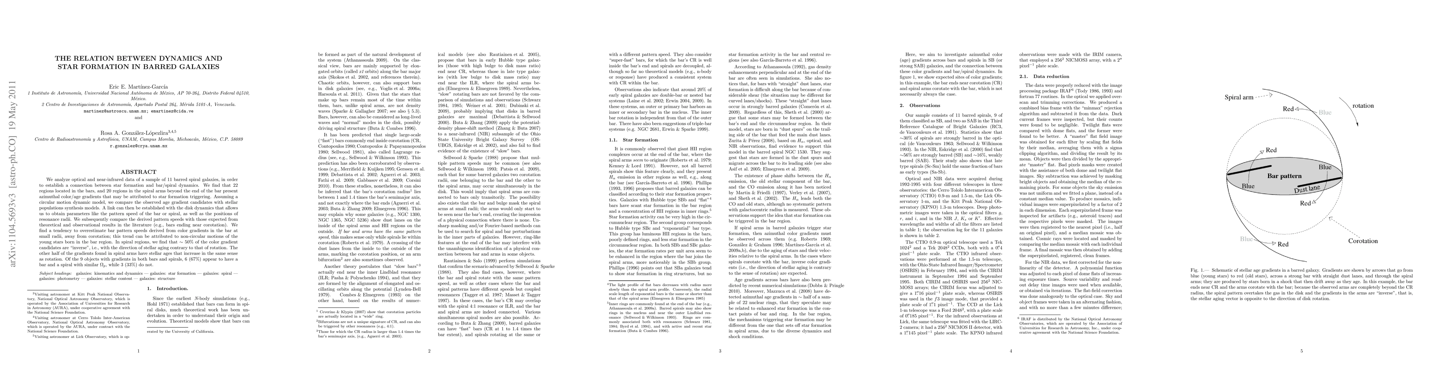 A study of 11 barred spiral galaxies found a connection between star formation, bar dynamics, and spiral structure, suggesting that bars trigger star formation in regions with azimuthal color/age gradients.