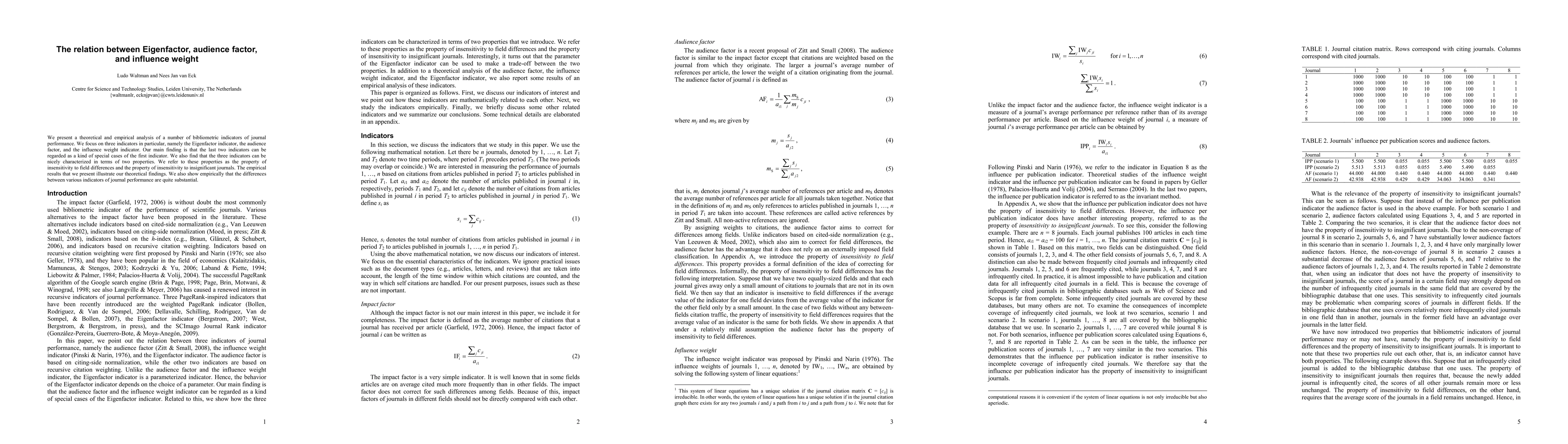 We present a theoretical and empirical analysis of a number of bibliometric indicators of journal performance. We focus on three indicators in particular, namely the Eigenfactor indicator, the audience factor, and the influence weight indicator. Our main finding is that the last two indicators can be regarded as a kind of special cases of the first indicator. We also find that the three indicators can be nicely characterized in terms of two properties. We refer to these properties as the property of insensitivity to field differences and the property of insensitivity to insignificant journals. The empirical results that we present illustrate our theoretical findings. We also show empirically that the differences between various indicators of journal performance are quite substantial.