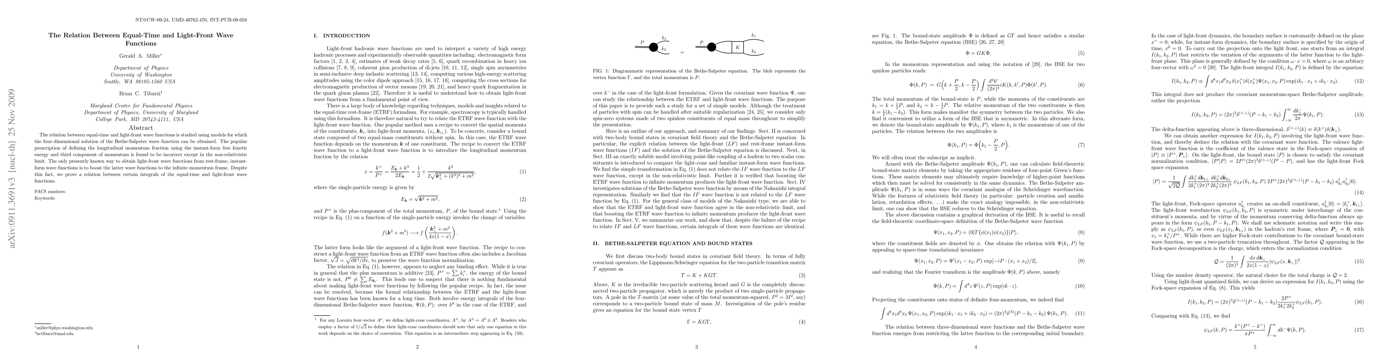 The relation between equal-time and light-front wave functions is studied using models for which the four-dimensional solution of the Bethe-Salpeter wave function can be obtained. The popular prescription of defining the longitudinal momentum fraction using the instant-form free kinetic energy and third component of momentum is found to be incorrect except in the non-relativistic limit. The only presently known way to obtain light-front wave functions from rest-frame, instant-form wave functions is to boost the latter wave functions to the infinite momentum frame. Despite this fact, we prove a relation between certain integrals of the equal-time and light-front wave functions.