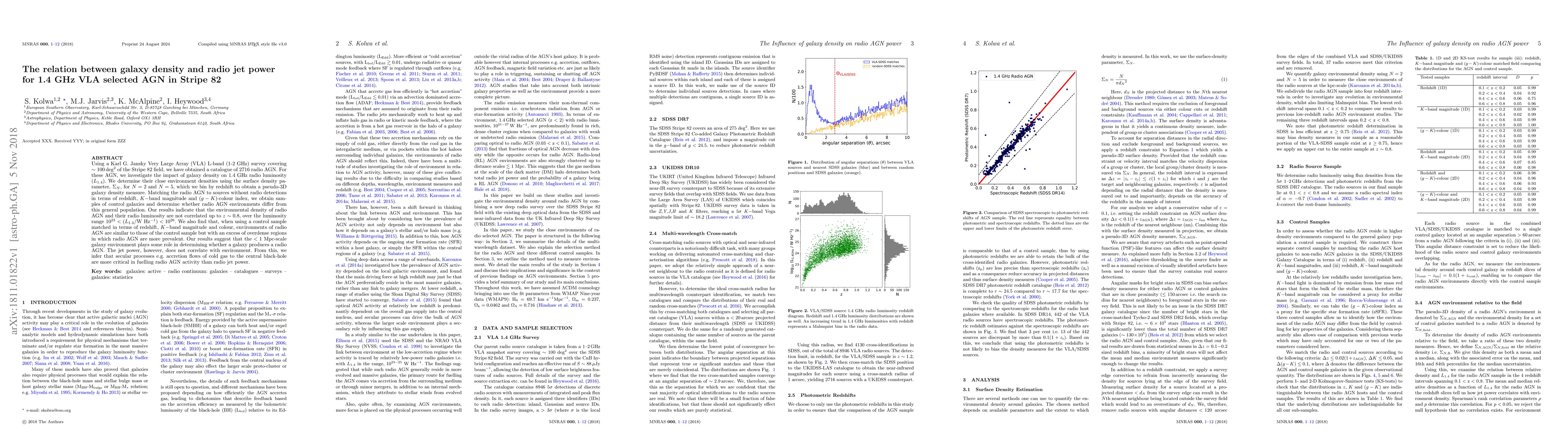 Using a Karl G. Jansky Very Large Array (VLA) L-band (1-2 GHz) survey covering $\sim100$\,deg$^2$ of the Stripe 82 field, we have obtained a catalogue of 2716 radio AGN. For these AGN, we investigate the impact of galaxy density on 1.4 GHz radio luminosity ($L_{1.4}$). We determine their close environment densities using the surface density parameter, $\Sigma_N,$ for $N=2$ and $N=5,$ which we bin by redshift to obtain a pseudo-3D galaxy density measure. Matching the radio AGN to sources without radio detections in terms of redshift, $K-$band magnitude and ($g-K$)-colour index, we obtain samples of control galaxies and determine whether radio AGN environments differ from this general population. Our results indicate that the environmental density of radio AGN and their radio luminosity are not correlated up to $z$ $\sim0.8$, over the luminosity range $10^{23} < (L_{1.4} / $W~Hz$^{-1}) < 10^{26}$. We also find that, when using a control sample matched in terms of redshift, $K-$band magnitude and colour, environments of radio AGN are similar to those of the control sample but with an excess of overdense regions in which radio AGN are more prevalent. Our results suggest that the $<1$ Mpc-scale galaxy environment plays some role in determining whether a galaxy produces a radio AGN. The jet power, however, does not correlate with environment. From this, we infer that secular processes e.g. accretion flows of cold gas to the central black-hole are more critical in fuelling radio AGN activity than radio jet power.