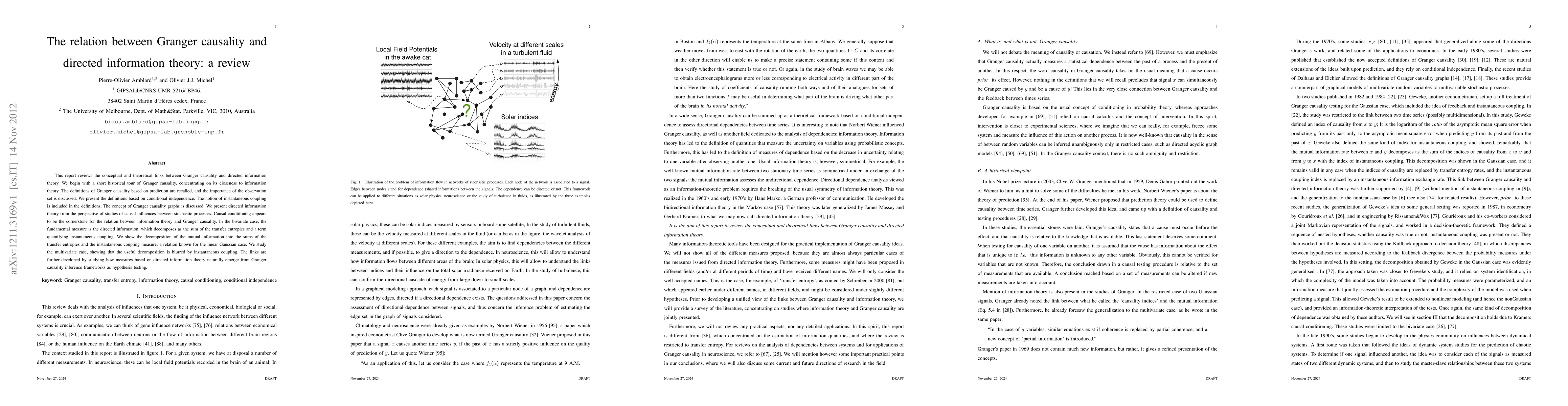 This report reviews the conceptual and theoretical links between Granger causality and directed information theory. We begin with a short historical tour of Granger causality, concentrating on its closeness to information theory. The definitions of Granger causality based on prediction are recalled, and the importance of the observation set is discussed. We present the definitions based on conditional independence. The notion of instantaneous coupling is included in the definitions. The concept of Granger causality graphs is discussed. We present directed information theory from the perspective of studies of causal influences between stochastic processes. Causal conditioning appears to be the cornerstone for the relation between information theory and Granger causality. In the bivariate case, the fundamental measure is the directed information, which decomposes as the sum of the transfer entropies and a term quantifying instantaneous coupling. We show the decomposition of the mutual information into the sums of the transfer entropies and the instantaneous coupling measure, a relation known for the linear Gaussian case. We study the multivariate case, showing that the useful decomposition is blurred by instantaneous coupling. The links are further developed by studying how measures based on directed information theory naturally emerge from Granger causality inference frameworks as hypothesis testing.