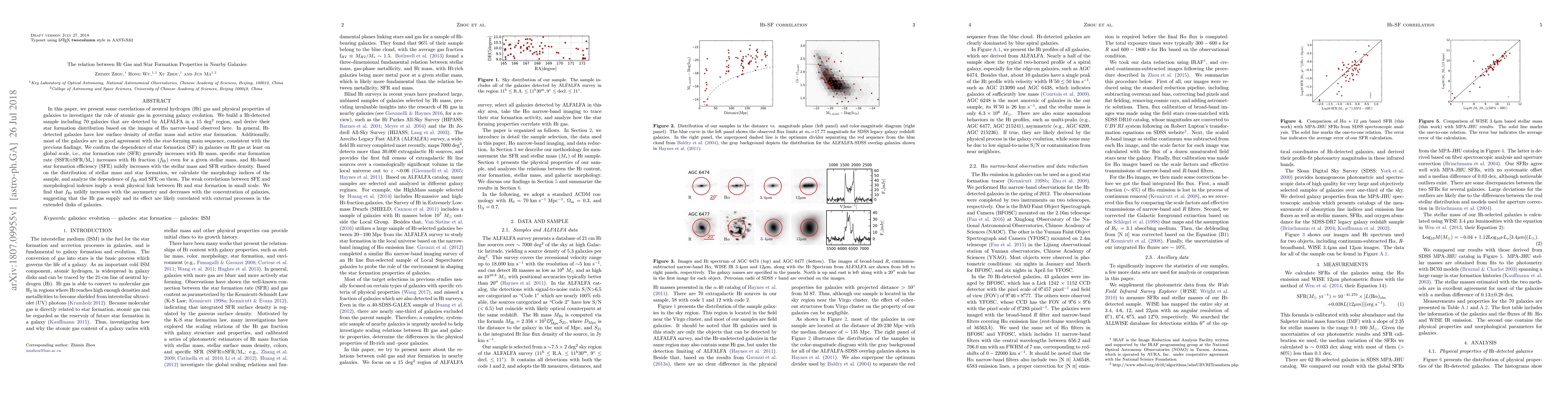 This paper investigates the relationship between neutral hydrogen (HI) gas and star formation in 70 nearby galaxies detected by ALFALFA. The study finds that galaxies with more HI gas tend to have higher star formation rates and specific star formation rates, indicating a global correlation between HI gas and star formation. However, the weak correlations between star formation efficiency and morphological indices suggest a limited direct link between HI gas and star formation on smaller scales.