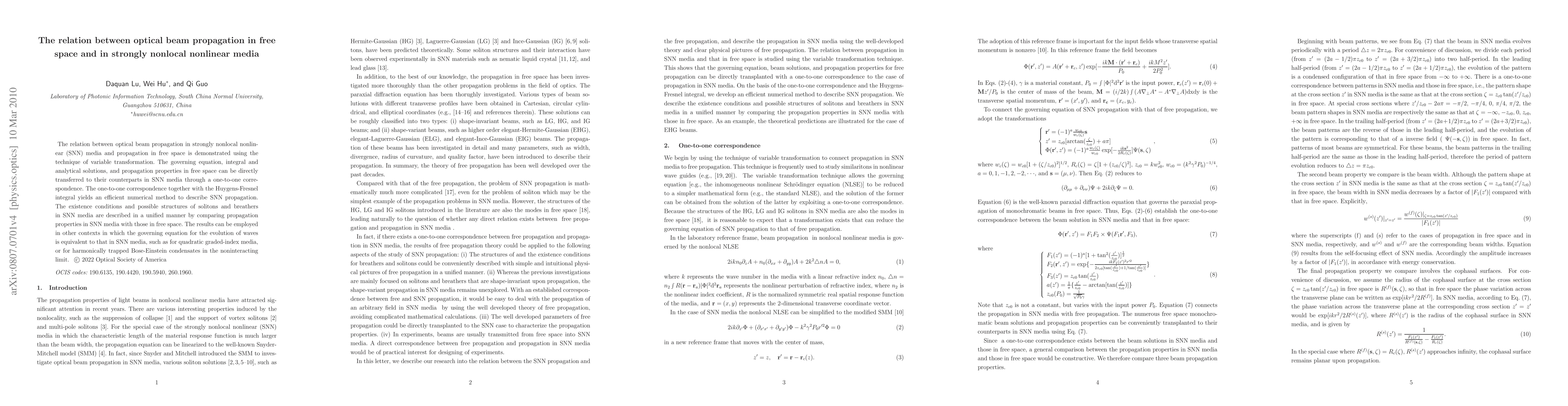 This paper demonstrates the relation between optical beam propagation in free space and strongly nonlocal nonlinear media using variable transformation techniques. It establishes a one-to-one correspondence between the governing equations and propagation properties, enabling efficient numerical methods for describing SNN media and revealing soliton and breather structures.