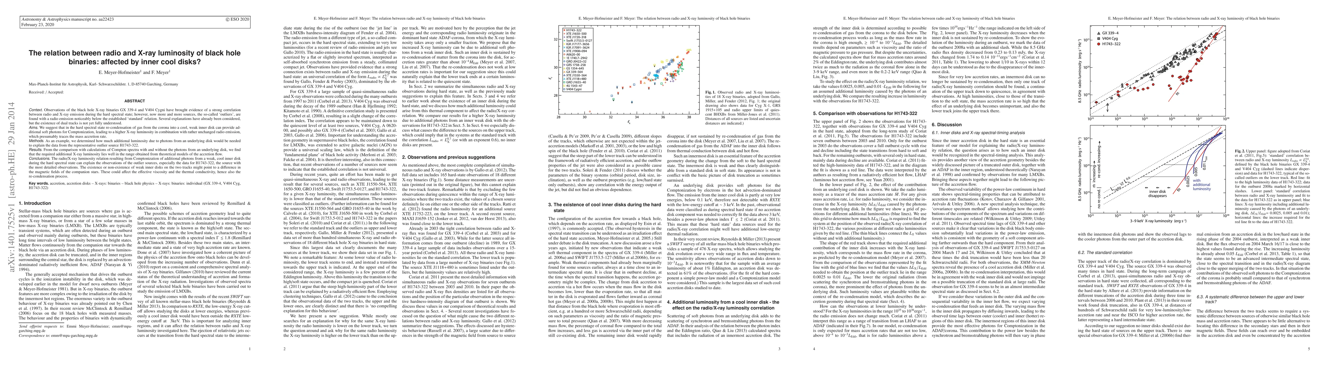 Observations of the black hole X-ray binaries GX 339-4 and V404 Cygni have brought evidence of a strong correlation between radio and X-ray emission during the hard spectral state; however, now more and more sources, the so-called `outliers', are found with a radio emission noticeably below the established `standard' relation. Several explanations have already been considered, but the existence of dual tracks is not yet fully understood. We suggest that in the hard spectral state re-condensation of gas from the corona into a cool, weak inner disk can provide additional soft photons for Comptonization, leading to a higher X-ray luminosity in combination with rather unchanged radio emission, which presumably traces the mass accretion rate. As an example, we determined how much additional luminosity due to photons from an underlying disk would be needed to explain the data from the representative outlier source H1743-322. From the comparison with calculations of Compton spectra with and without the photons from an underlying disk, we find that the required additional X-ray luminosity lies well in the range obtained from theoretical models of the accretion flow. The radio/X-ray luminosity relation resulting from Comptonization of additional photons from a weak, cool inner disk during the hard spectral state can explain the observations of the outlier sources, especially the data for H1743-322, the source with the most detailed observations. The existence or non-existence of weak inner disks on the two tracks might point to a difference in the magnetic fields of the companion stars. These could affect the effective viscosity and the thermal conductivity, hence also the re-condensation process.