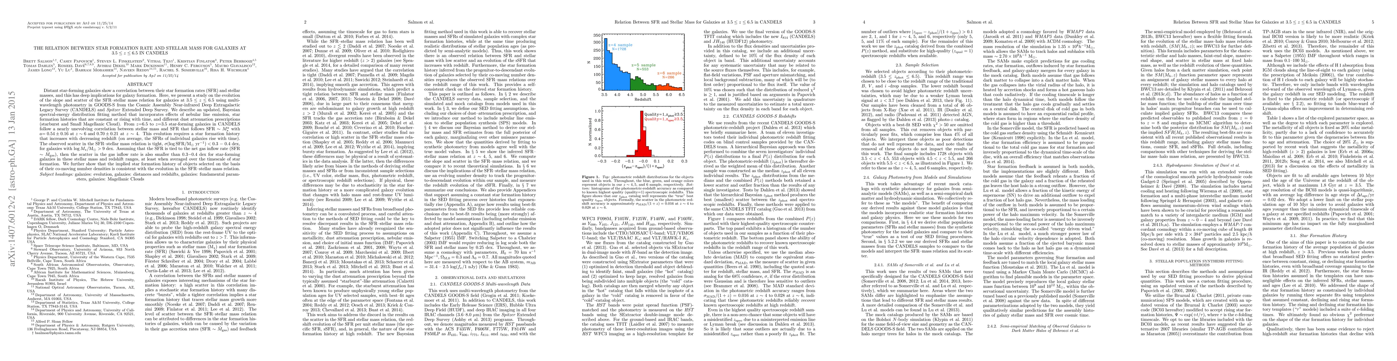 Distant star-forming galaxies show a correlation between their star formation rates (SFR) and stellar masses, and this has deep implications for galaxy formation. Here, we present a study on the evolution of the slope and scatter of the SFR-stellar mass relation for galaxies at $3.5\leq z\leq 6.5$ using multi-wavelength photometry in GOODS-S from the Cosmic Assembly Near-infrared Deep Extragalactic Legacy Survey (CANDELS) and Spitzer Extended Deep Survey. We describe an updated, Bayesian spectral-energy distribution fitting method that incorporates effects of nebular line emission, star formation histories that are constant or rising with time, and different dust attenuation prescriptions (starburst and Small Magellanic Cloud). From $z$=6.5 to $z$=3.5 star-forming galaxies in CANDELS follow a nearly unevolving correlation between stellar mass and SFR that follows SFR $\sim$ $M_\star^a$ with $a = 0.54 \pm 0.16$ at $z\sim 6$ and $0.70 \pm 0.21$ at $z\sim 4$. This evolution requires a star formation history that increases with decreasing redshift (on average, the SFRs of individual galaxies rise with time). The observed scatter in the SFR-stellar mass relation is tight, $\sigma(\log \mathrm{SFR}/\mathrm{M}_\odot$ yr$^{-1})< 0.3\ - $ 0.4 dex, for galaxies with $\log M_\star/\mathrm{M}_\odot > 9$ dex. Assuming that the SFR is tied to the net gas inflow rate (SFR $\sim$ $\dot{M}_\mathrm{gas}$), then the scatter in the gas inflow rate is also smaller than 0.3$-$0.4 dex for star-forming galaxies in these stellar mass and redshift ranges, at least when averaged over the timescale of star formation. We further show that the implied star formation history of objects selected on the basis of their co-moving number densities is consistent with the evolution in the SFR-stellar mass relation.