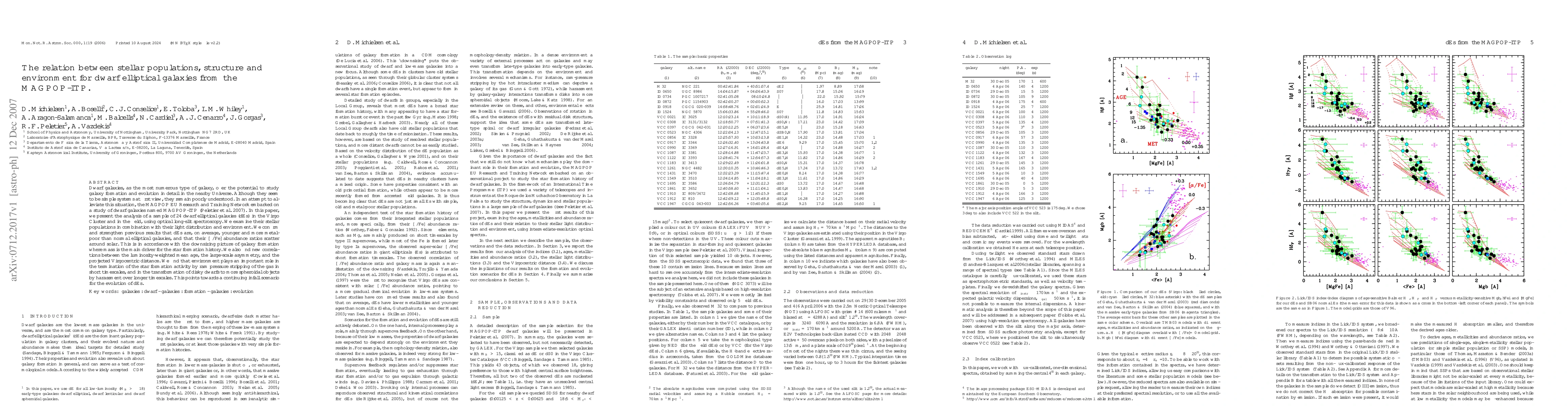 Dwarf galaxies, as the most numerous type of galaxy, offer the potential to study galaxy formation and evolution in detail in the nearby Universe. Although they seem to be simple systems at first view, they remain poorly understood. In an attempt to alleviate this situation, the MAGPOP EU Research and Training Network embarked on a study of dwarf galaxies named MAGPOP-ITP (Peletier et al., 2007). In this paper, we present the analysis of a sample of 24 dwarf elliptical galaxies (dEs) in the Virgo Cluster and in the field, using optical long-slit spectroscopy. We examine their stellar populations in combination with their light distribution and environment. We confirm and strengthen previous results that dEs are, on average, younger and more metal-poor than normal elliptical galaxies, and that their [alpha/Fe] abundance ratios scatter around solar. This is in accordance with the downsizing picture of galaxy formation where mass is the main driver for the star formation history. We also find new correlations between the luminosity-weighted mean age, the large-scale asymmetry, and the projected Virgocentric distance. We find that environment plays an important role in the termination of the star formation activity by ram pressure stripping of the gas in short timescales, and in the transformation of disky dwarfs to more spheroidal objects by harassment over longer timescales. This points towards a continuing infall scenario for the evolution of dEs.