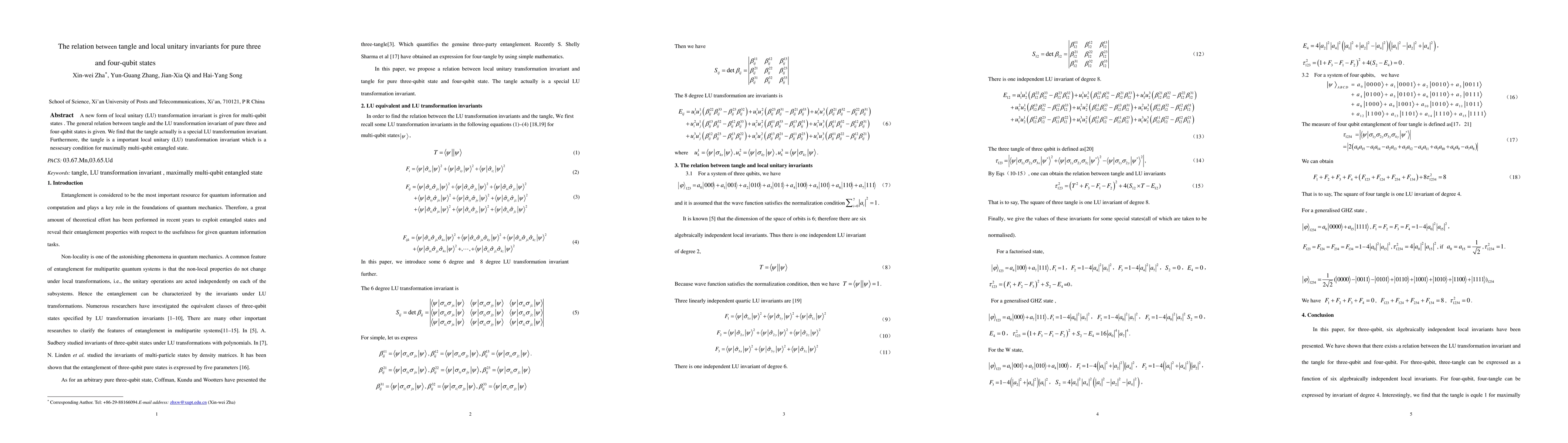 Summary: This paper introduces a new local unitary invariant for multi-qubit states and establishes a relationship between tangle and this invariant for pure three and four-qubit states, showing that tangle is a special case of this invariant and a necessary condition for maximal entanglement.