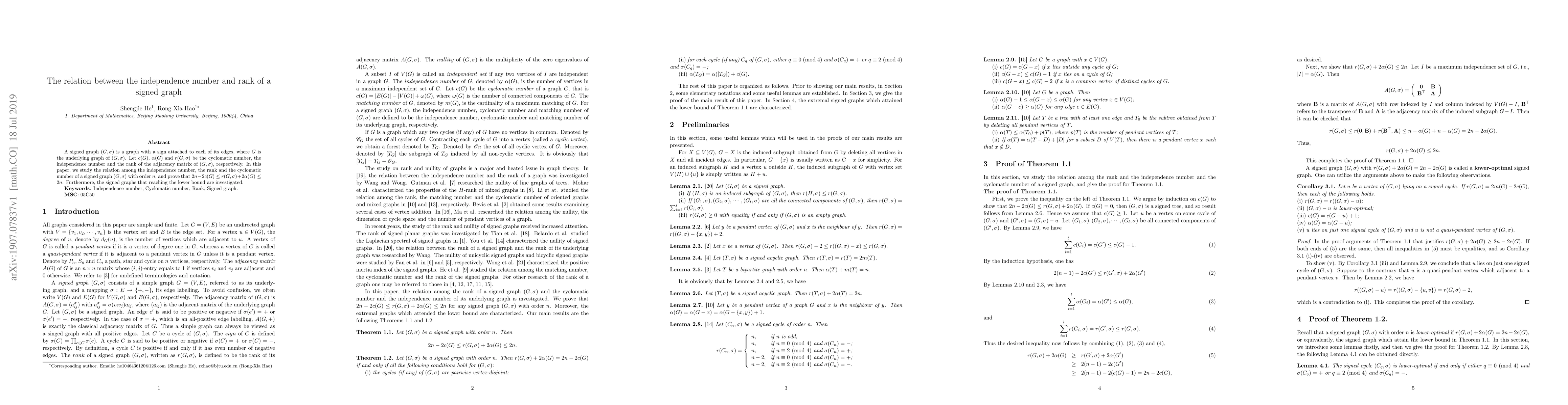 A signed graph $(G, \sigma)$ is a graph with a sign attached to each of its edges, where $G$ is the underlying graph of $(G, \sigma)$. Let $c(G)$, $\alpha(G)$ and $r(G, \sigma)$ be the cyclomatic number, the independence number and the rank of the adjacency matrix of $(G, \sigma)$, respectively. In this paper, we study the relation among the independence number, the rank and the cyclomatic number of a signed graph $(G, \sigma)$ with order $n$, and prove that $2n-2c(G) \leq r(G, \sigma)+2\alpha(G) \leq 2n$. Furthermore, the signed graphs that reaching the lower bound are investigated.