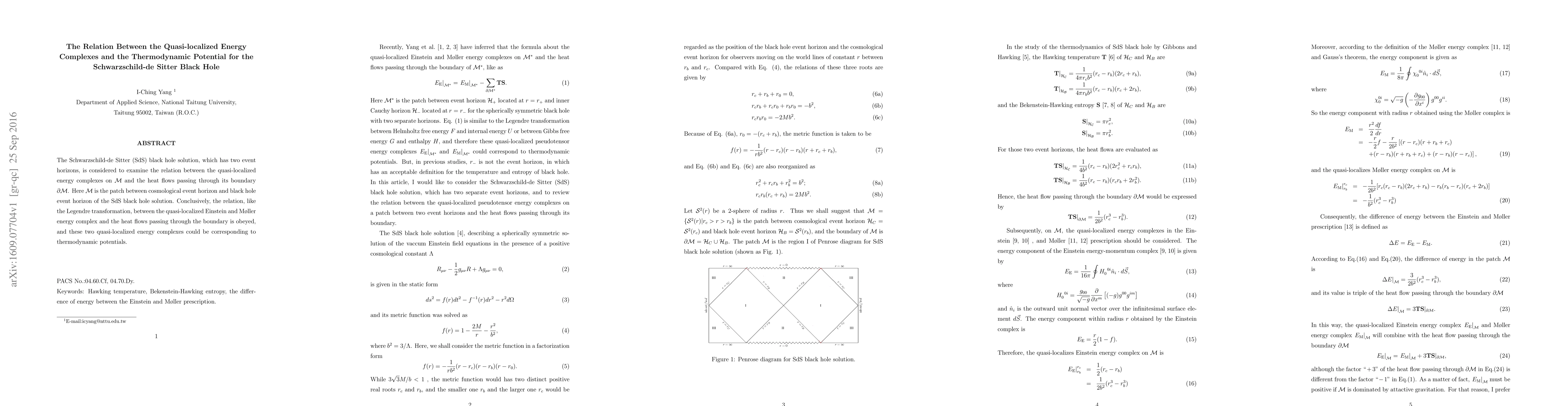 The Schwarzschild-de Sitter (SdS) black hole solution, which has two event horizons, is considered to examine the relation between the quasi-localized energy complexes on ${\cal M}$ and the heat flows passing through its boundary $\partial {\cal M}$. Here ${\cal M}$ is the patch between cosmological event horizon and black hole event horizon of the SdS black hole solution. Conclusively, the relation, like the Legendre transformation, between the quasi-localized Einstein and M{\o}ller energy complex and the heat flows passing through the boundary is obeyed, and these two quasi-localized energy complexes could be corresponding to thermodynamic potentials.