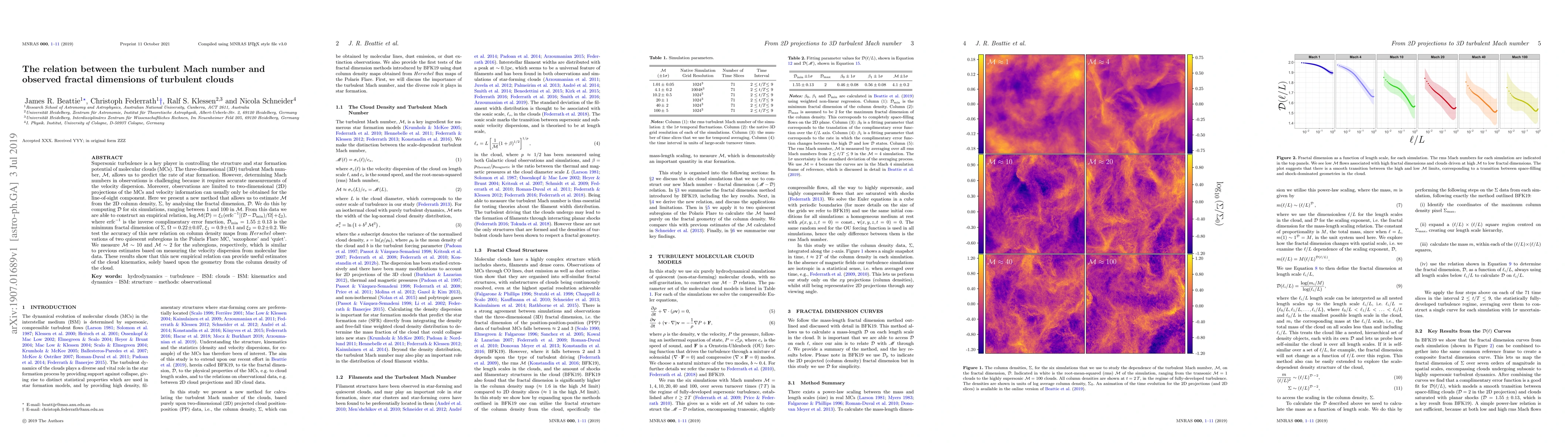 Supersonic turbulence is a key player in controlling the structure and star formation potential of molecular clouds (MCs). The three-dimensional (3D) turbulent Mach number, $\mathcal{M}$, allows us to predict the rate of star formation. However, determining Mach numbers in observations is challenging because it requires accurate measurements of the velocity dispersion. Moreover, observations are limited to two-dimensional (2D) projections of the MCs and velocity information can usually only be obtained for the line-of-sight component. Here we present a new method that allows us to estimate $\mathcal{M}$ from the 2D column density, $\Sigma$, by analysing the fractal dimension, $\mathcal{D}$. We do this by computing $\mathcal{D}$ for six simulations, ranging between $1$ and $100$ in $\mathcal{M}$. From this data we are able to construct an empirical relation, $\log\mathcal{M}(\mathcal{D}) = \xi_1(\text{erfc}^{-1} [(\mathcal{D}-\mathcal{D}_{\text{min}})/\Omega] + \xi_2),$ where $\text{erfc}^{-1}$ is the inverse complimentary error function, $\mathcal{D}_{\text{min}} = 1.55 \pm 0.13$ is the minimum fractal dimension of $\Sigma$, $\Omega = 0.22 \pm 0.07$, $\xi_1 = 0.9 \pm 0.1$ and $\xi_2 = 0.2 \pm 0.2$. We test the accuracy of this new relation on column density maps from $Herschel$ observations of two quiescent subregions in the Polaris Flare MC, `saxophone' and `quiet'. We measure $\mathcal{M} \sim 10$ and $\mathcal{M} \sim 2$ for the subregions, respectively, which is similar to previous estimates based on measuring the velocity dispersion from molecular line data. These results show that this new empirical relation can provide useful estimates of the cloud kinematics, solely based upon the geometry from the column density of the cloud.