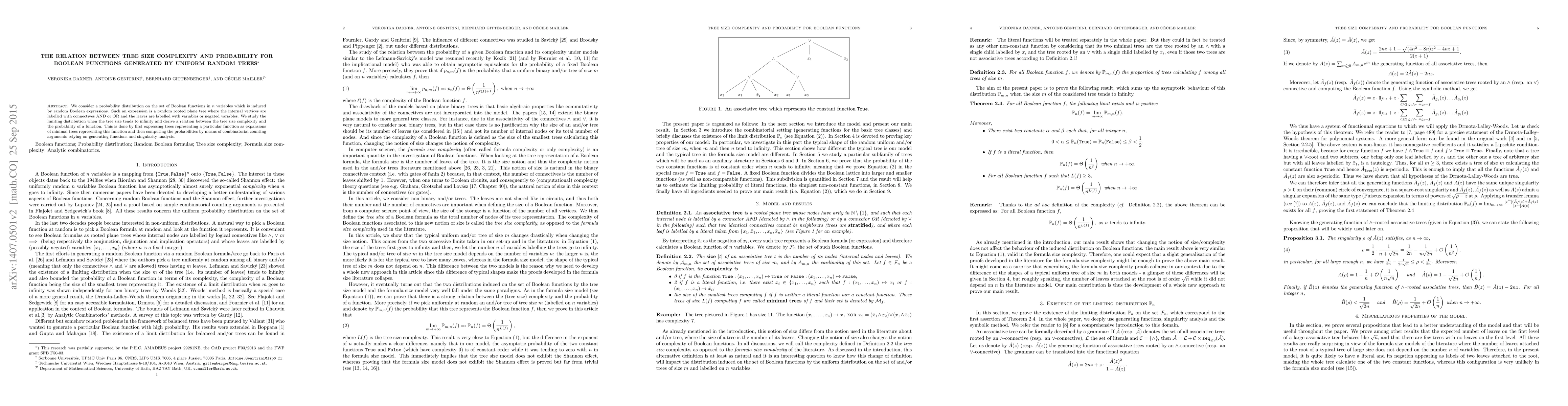 We consider a probability distribution on the set of Boolean functions in n variables which is induced by random Boolean expressions. Such an expression is a random rooted plane tree where the internal vertices are labelled with connectives And and OR and the leaves are labelled with variables or negated variables. We study limiting distribution when the tree size tends to infinity and derive a relation between the tree size complexity and the probability of a function. This is done by first expressing trees representing a particular function as expansions of minimal trees representing this function and then computing the probabilities by means of combinatorial counting arguments relying on generating functions and singularity analysis.
