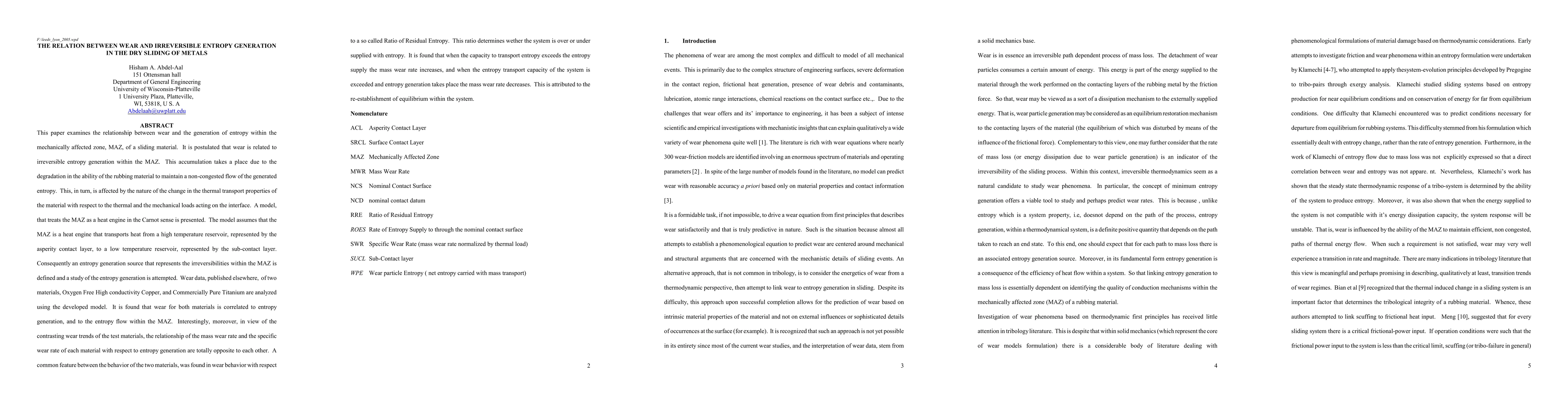 We examine the relationship between wear and the generation of entropy in dry sliding of metals. It is postulated that wear is related to irreversible entropy generation within the MAZ. We present a model, that treats the MAZ as a heat engine in the Carnot sense. The model assumes that the MAZ is a heat engine that transports heat from a high temperature reservoir, represented by the asperity contact layer, to a low temperature reservoir, represented by the sub-contact layer. Consequently an entropy generation source that represents the irreversibilities within the MAZ is defined and a study of the entropy generation is attempted. Wear data, published elsewhere, of two materials, Oxygen Free High conductivity Copper, and Commercially Pure Titanium are analyzed using the developed model. It is found that wear for both materials is correlated to entropy generation, and to the entropy flow within the MAZ. Interestingly, moreover, in view of the contrasting wear trends of the test materials, the relationship of the mass wear rate and the specific wear rate of each material with respect to entropy generation are totally opposite to each other. A common feature between the behavior of the two materials, was found in wear behavior with respect to a so called Ratio of Residual Entropy. This ratio determines wether the system is over or under supplied with entropy. It is found that when the capacity to transport entropy exceeds the entropy supply the mass wear rate increases, and when the entropy transport capacity of the system is exceeded and entropy generation takes place the mass wear rate decreases. This is attributed to the re-establishment of equilibrium within the system.