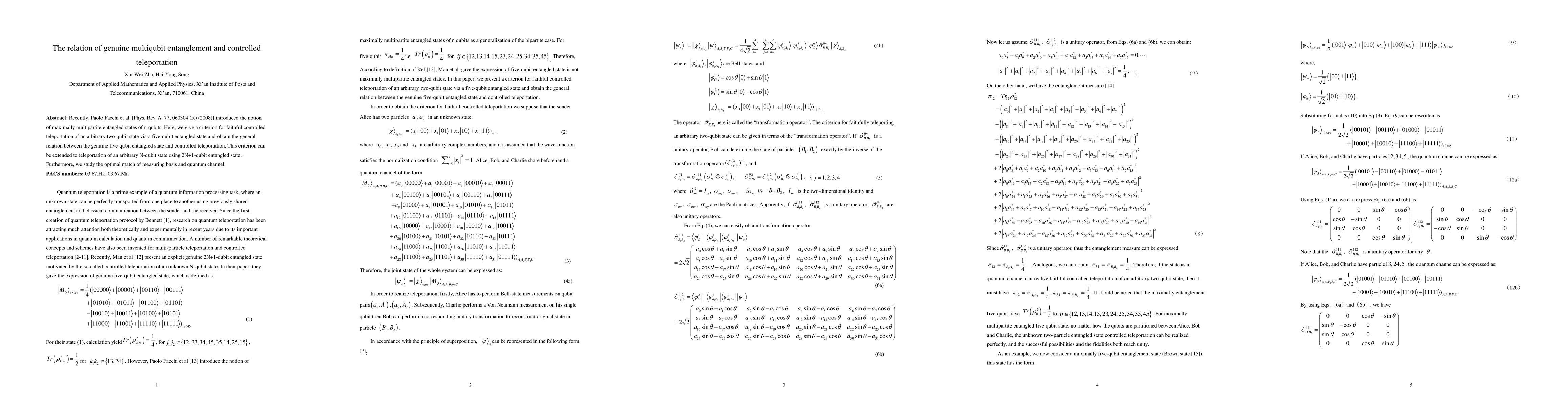 Recently, Paolo Facchi et al. [Phys. Rev. A. 77, 060304 (R) (2008)] introduced the notion of maximally multipartite entangled states of n qubits. Here, we give a criterion for faithful controlled teleportation of an arbitrary two-qubit state via a five-qubit entangled state and obtain the general relation between the genuine five-qubit entangled state and controlled teleportation. This criterion can be extended to teleportation of an arbitrary N-qubit state using 2N+1-qubit entangled state. Furthermore, we study the optimal match of measuring basis and quantum channel.