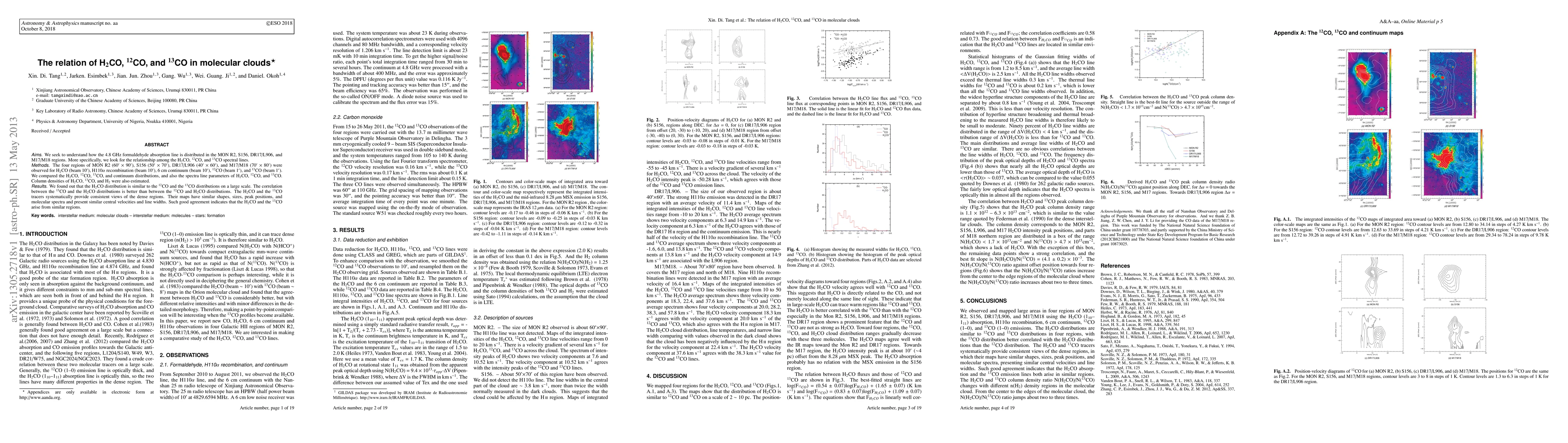 Aims. We seek to understand how the 4.8 GHz formaldehyde absorption line is distributed in the MON R2, S156, DR17/L906, and M17/M18 regions. More specifically, we look for the relationship among the H2CO, 12CO, and 13CO spectral lines. Methods. The four regions of MON R2 (60'x90'), S156 (5'0x70'), DR17/L906 (40'x60'), and M17 /M18 (70'x80')were observed for H2CO (beam 10'), H110a recombination (beam 10'), 6 cm continuum (beam 10'), 12CO (beam 1'), and 13CO (beam 1'). We compared the H2CO,12CO,13CO, and continuum distributions, and also the spectra line parameters of H2CO,12CO, and 13CO. Column densities of H2CO,13CO, and H2 were also estimated. Results. We found out that the H2CO distribution is similar to the 12CO and the 13CO distributions on a large scale. The correlation between the 13 CO and the H2CO distributions is better than between the 12CO and H2CO distributions. The H2CO and the 13CO tracers systematically provide consistent views of the dense regions. T heir maps have similar shapes, sizes, peak positions, and molecular spectra and present similar centr al velocities and line widths. Such good agreement indicates that the H2CO and the 13CO arise from similar regions.
