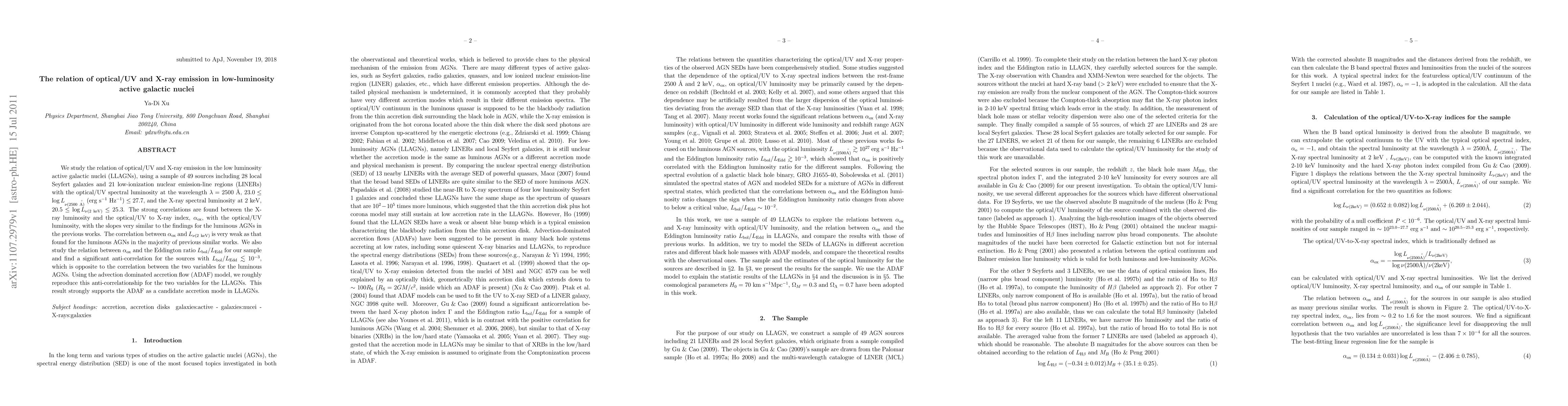 This study investigates the correlation between optical/UV and X-ray emissions in low-luminosity active galactic nuclei (LLAGNs), finding strong correlations between X-ray luminosity and optical/UV to X-ray index, similar to luminous AGNs. An anti-correlation between the optical/UV to X-ray index and the Eddington ratio is observed, supporting the advection-dominated accretion flow model for LLAGNs.