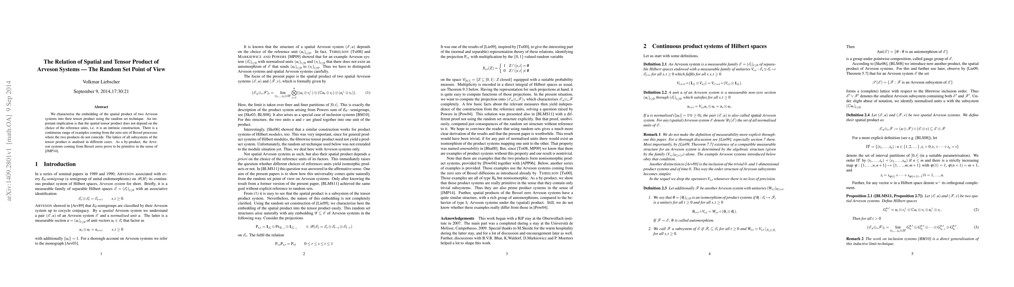 This paper characterizes the embedding of the spatial product of two Arveson systems into their tensor product using random set techniques, demonstrating that the spatial tensor product is an intrinsic construction independent of reference units. It also identifies a continuous range of examples from Bessel processes where the spatial and tensor products diverge, and analyzes the lattice of subsystems in the tensor product.