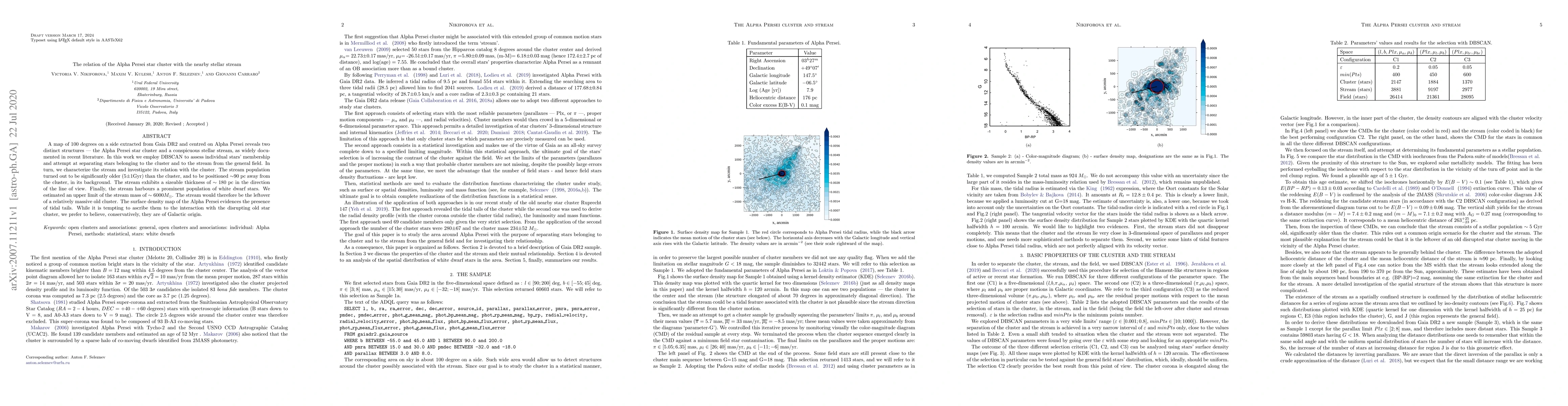 A map of 100 degrees on a side extracted from Gaia DR2 and centred on Alpha Persei reveals two distinct structures | the Alpha Persei star cluster and a conspicuous stellar stream, as widely documented in recent literature. In this work we employ DBSCAN to assess individual stars' membership and attempt at separating stars belonging to the cluster and to the stream from the general field. In turn, we characterize the stream and investigate its relation with the cluster. The stream population turned out to be significantly older (5+/-1Gyr) than the cluster, and to be positioned ~90 pc away from the cluster, in its background. The stream exhibits a sizeable thickness of ~180 pc in the direction of the line of view. Finally, the stream harbours a prominent population of white dwarf stars. We estimated an upper limit of the stream mass of ~6000 solar masses?. The stream would therefore be the leftover of a relatively massive old cluster. The surface density map of the Alpha Persei evidences the presence of tidal tails. While it is tempting to ascribe them to the interaction with the disrupting old star cluster, we prefer to believe, conservatively, they are of Galactic origin.