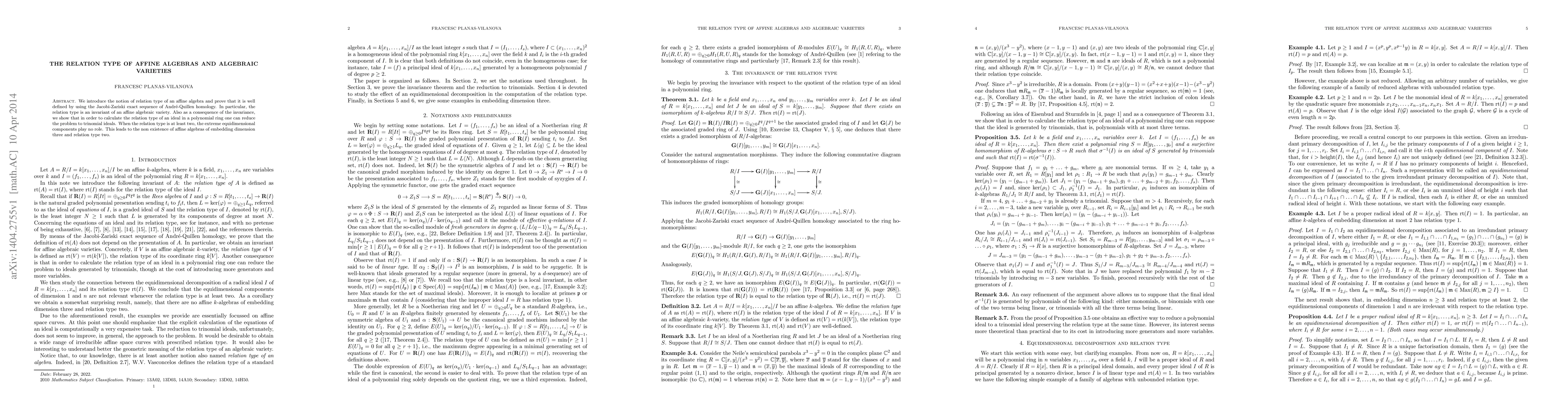 This paper introduces the concept of 'relation type' for affine algebras, proving it's an invariant for algebraic varieties. It simplifies calculating relation type of ideals in polynomial rings to trinomial ideals, and reveals the non-existence of affine algebras with embedding dimension three and relation type two.