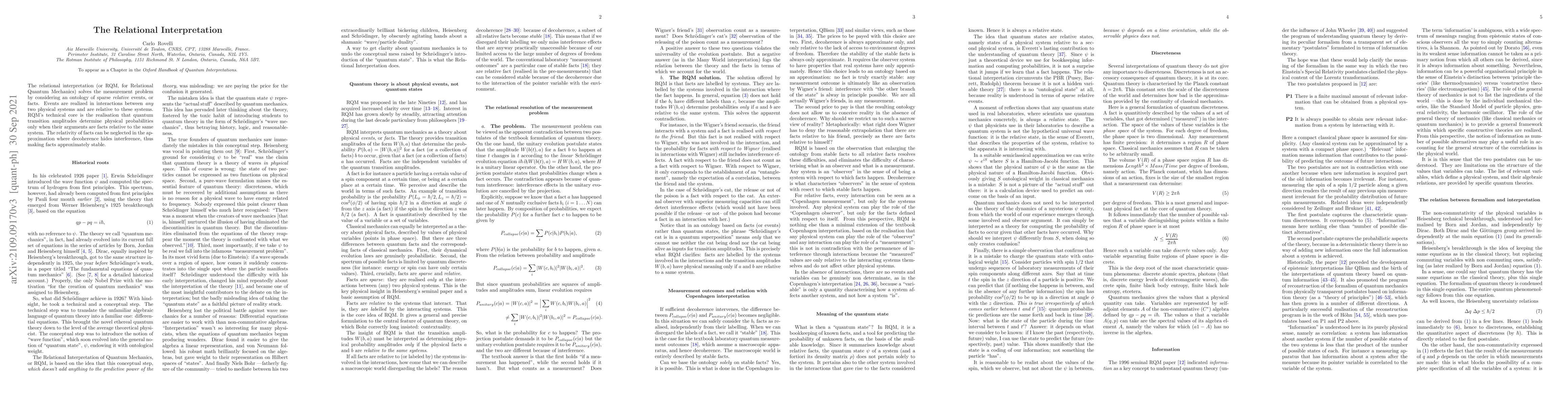 The relational interpretation of quantum mechanics (RQM) resolves the measurement problem by defining physical facts as relative events occurring during interactions between systems, with quantum transition amplitudes determining probabilities only when they pertain to the same system. Decoherence approximates stability by obscuring interference.