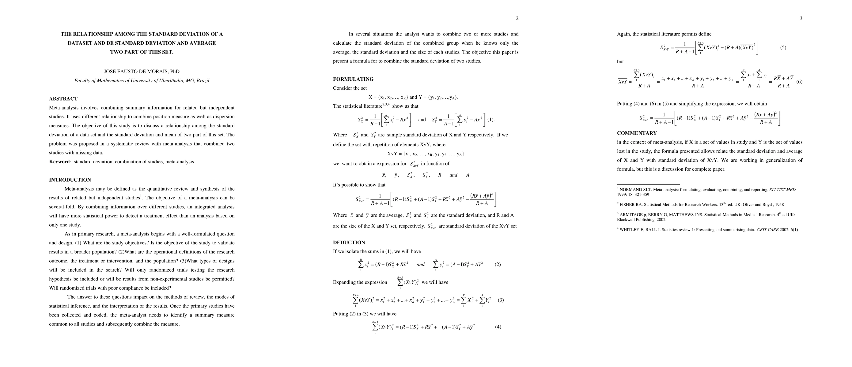 Meta-analysis involves combining summary information for related but independent studies. It uses different relationship to combine position measure as well as dispersion measures. The objective of this study is to discuss a relationship among the standard deviation of a data set and the standard deviation and mean of two part of this set. The problem was proposed in a systematic review with meta-analysis that combined two studies with missing data.