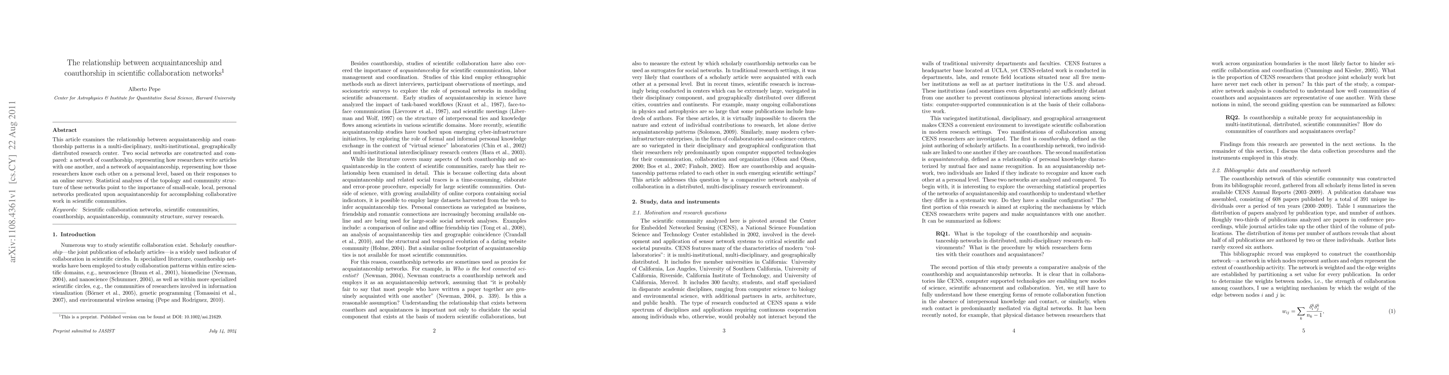 This article examines the relationship between acquaintanceship and coauthorship patterns in a multi-disciplinary, multi-institutional, geographically distributed research center. Two social networks are constructed and compared: a network of coauthorship, representing how researchers write articles with one another, and a network of acquaintanceship, representing how those researchers know each other on a personal level, based on their responses to an online survey. Statistical analyses of the topology and community structure of these networks point to the importance of small-scale, local, personal networks predicated upon acquaintanceship for accomplishing collaborative work in scientific communities.