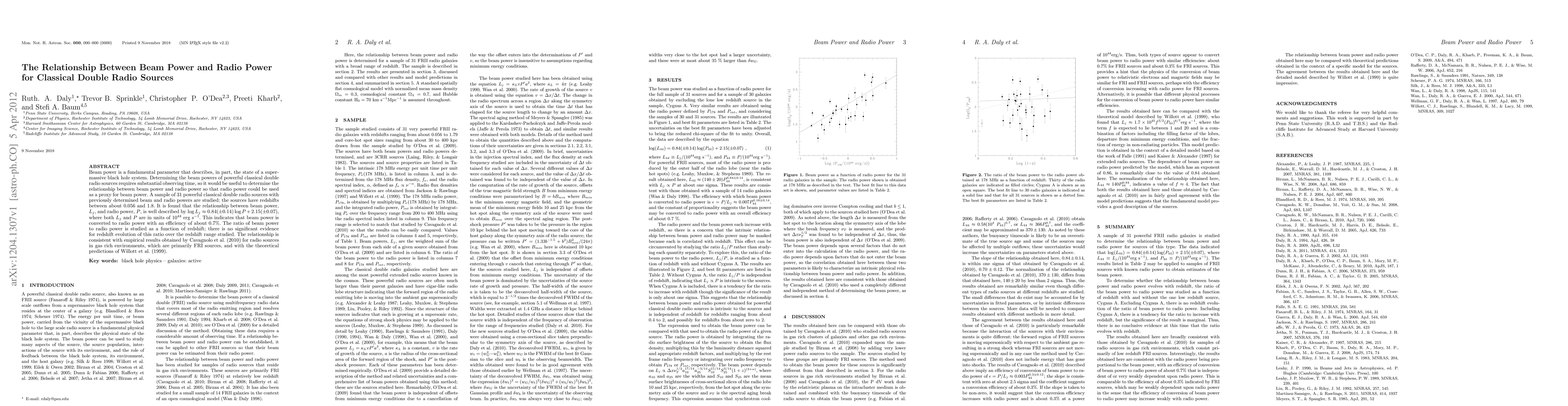This study investigates the relationship between beam power and radio power in 31 classical double radio sources, finding a linear correlation described by Log(Lj) = 0.84 Log(P) + 2.15, indicating an efficiency of about 0.7% in converting beam power to radio power, with no significant redshift evolution over the studied range.