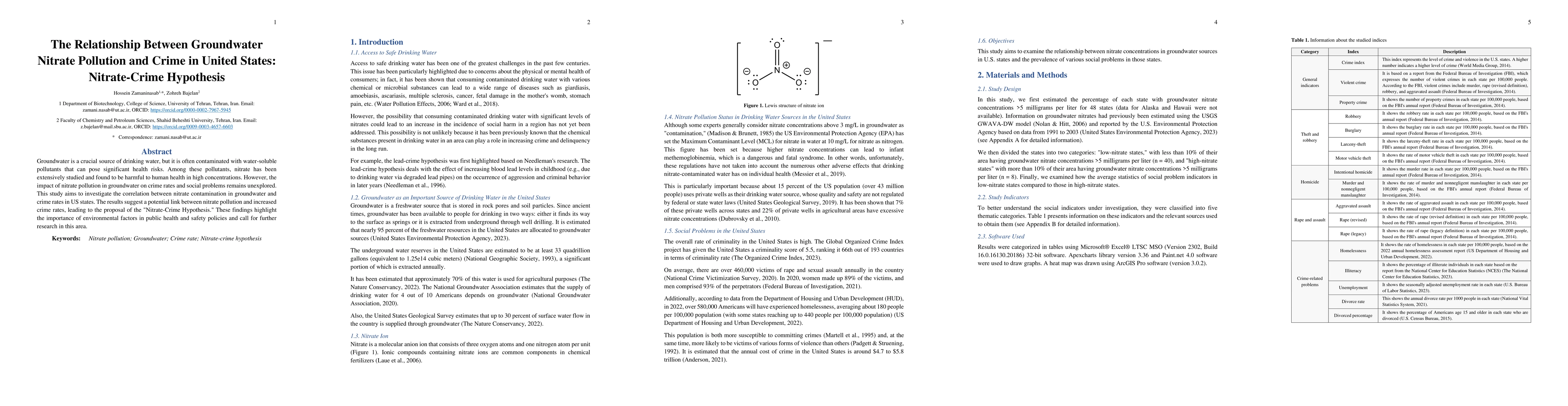 This study investigates the correlation between nitrate contamination in US groundwater and crime rates, proposing a "Nitrate-Crime Hypothesis" based on findings of a potential link between nitrate pollution and increased crime rates. The research underscores the need for considering environmental factors in public health and safety policies.