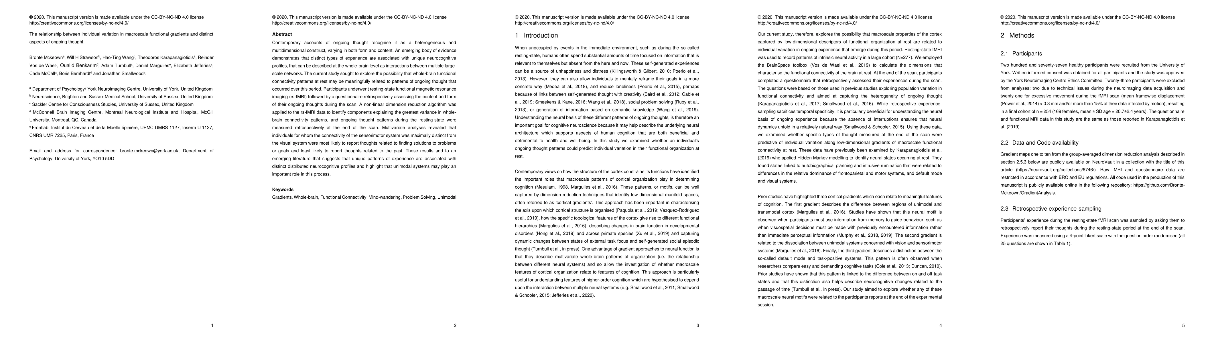Contemporary accounts of ongoing thought recognise it as a heterogeneous and multidimensional construct, varying in both form and content. An emerging body of evidence demonstrates that distinct types of experience are associated with unique neurocognitive profiles, that can be described at the whole-brain level as interactions between multiple large-scale networks. The current study sought to explore the possibility that whole-brain functional connectivity patterns at rest may be meaningfully related to patterns of ongoing thought that occurred over this period. Participants underwent resting-state functional magnetic resonance imaging (rs-fMRI) followed by a questionnaire retrospectively assessing the content and form of their ongoing thoughts during the scan. A non-linear dimension reduction algorithm was applied to the rs-fMRI data to identify components explaining the greatest variance in whole-brain connectivity patterns, and ongoing thought patterns during the resting-state were measured retrospectively at the end of the scan. Multivariate analyses revealed that individuals for whom the connectivity of the sensorimotor system was maximally distinct from the visual system were most likely to report thoughts related to finding solutions to problems or goals and least likely to report thoughts related to the past. These results add to an emerging literature that suggests that unique patterns of experience are associated with distinct distributed neurocognitive profiles and highlight that unimodal systems may play an important role in this process.