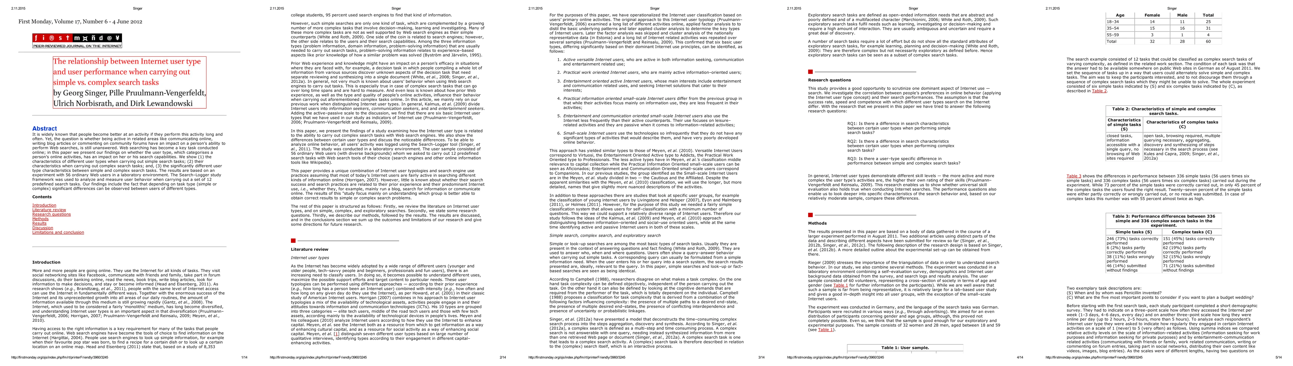 It is widely known that people become better at an activity if they perform this activity long and often. Yet, the question is whether being active in related areas like communicating online, writing blog articles or commenting on community forums have an impact on a persons ability to perform Web searches, is still unanswered. Web searching has become a key task conducted online; in this paper we present our findings on whether the user type, which categorises a persons online activities, has an impact on her or his search capabilities. We show (1) the characteristics of different user types when carrying out simple search tasks; (2) their characteristics when carrying out complex search tasks; and, (3) the significantly different user type characteristics between simple and complex search tasks. The results are based on an experiment with 56 ordinary Web users in a laboratory environment. The Search-Logger study framework was used to analyze and measure user behavior when carrying out a set of 12 predefined search tasks. Our findings include the fact that depending on task type (simple or complex) significant differences can be observed between users of different types.